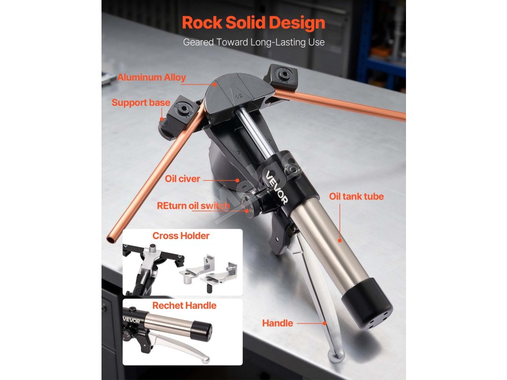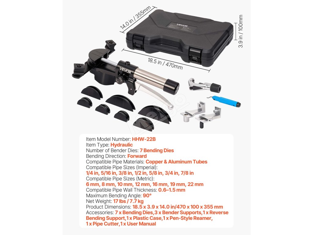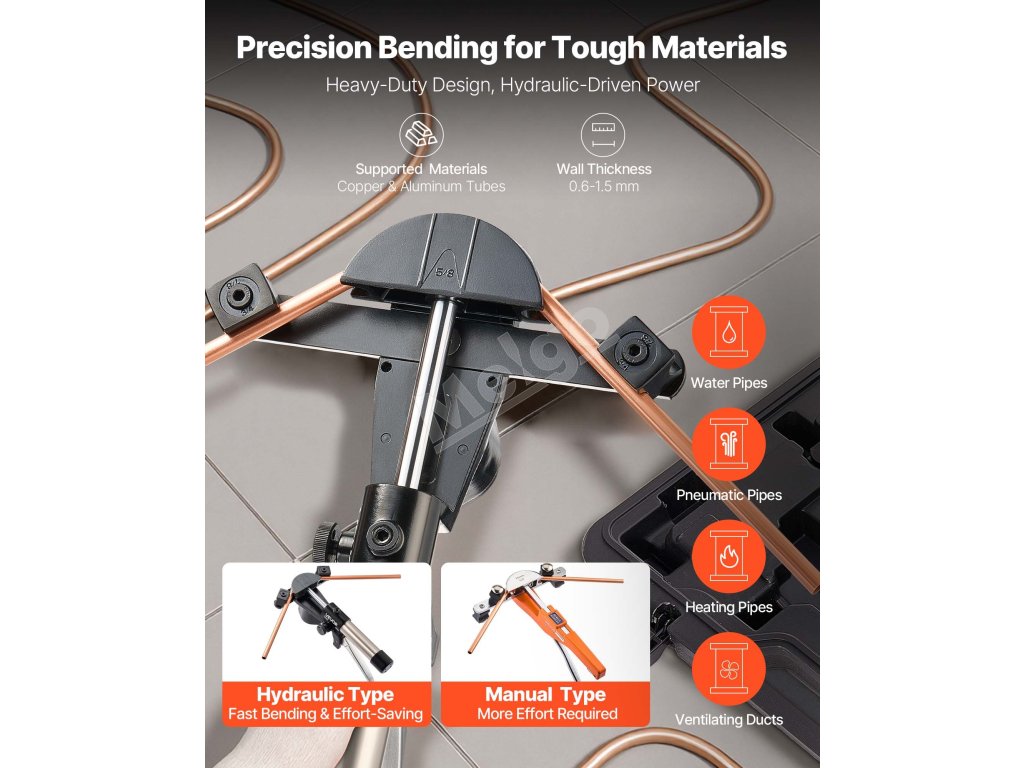 Tento ohýbač rúrok, poháňaný hydraulickým systémom, ľahko ohýba medené a hliníkové rúrky s priemerom od 1/4 do 7/8 palca (6 až 22 mm). S uhlom ohybu od 0° do 90°, 7 maticami z hliníkovej zliatiny a konštrukciou umožňujúcou ohýbanie v dvoch smeroch je určený na inštaláciu systémov HVAC, opravy automobilov a priemyselnú údržbu.
