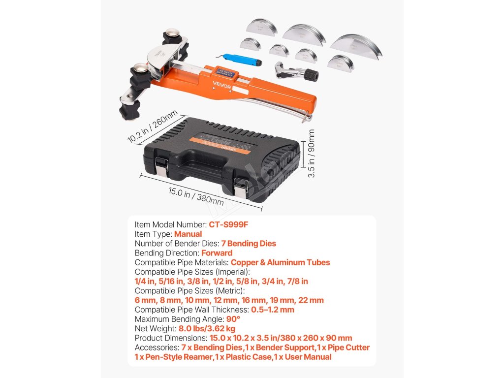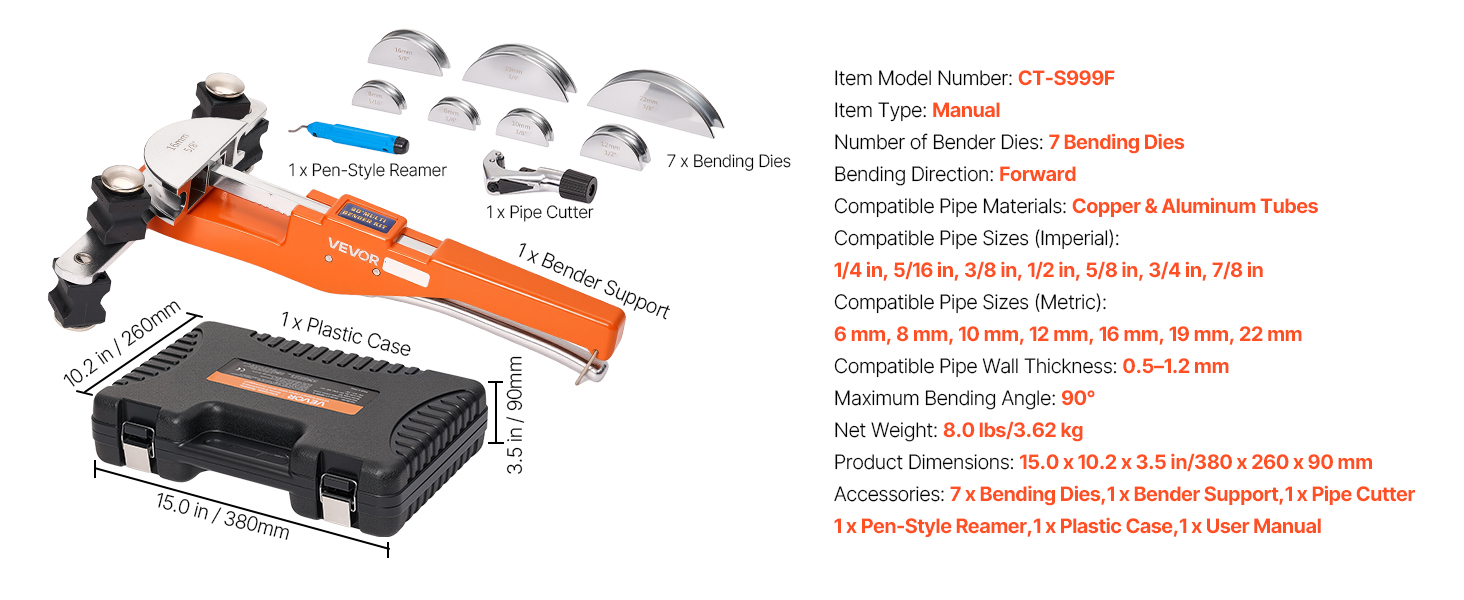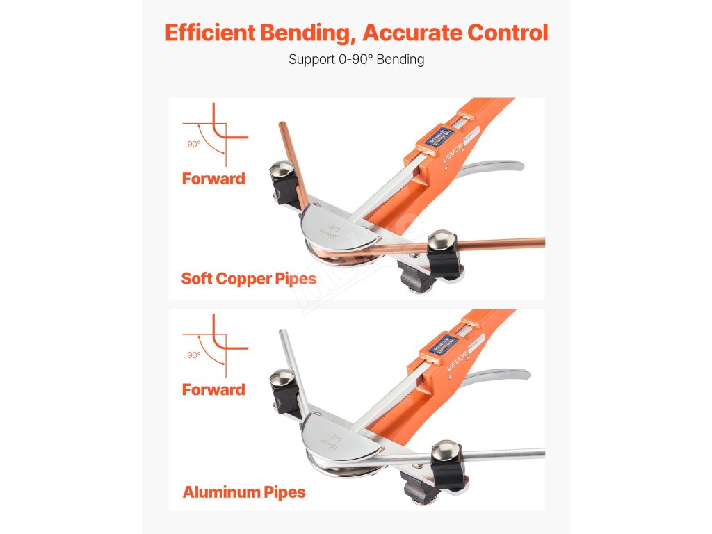 Tento ručný ohýbač rúrok s račňou je dodávaný s 7 maticami, ktoré umožňujú presné ohýbanie medených a hliníkových rúrok s priemerom od 1/4 palca do 7/8 palca (6 až 22 mm). S uhlom ohybu od 0° do 90° je ideálny pre inštaláciu klimatizačných systémov, opravy automobilov a domáce použitie. Kompaktná konštrukcia uľahčuje prenášanie a skladovanie.