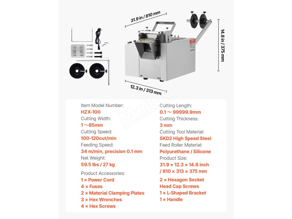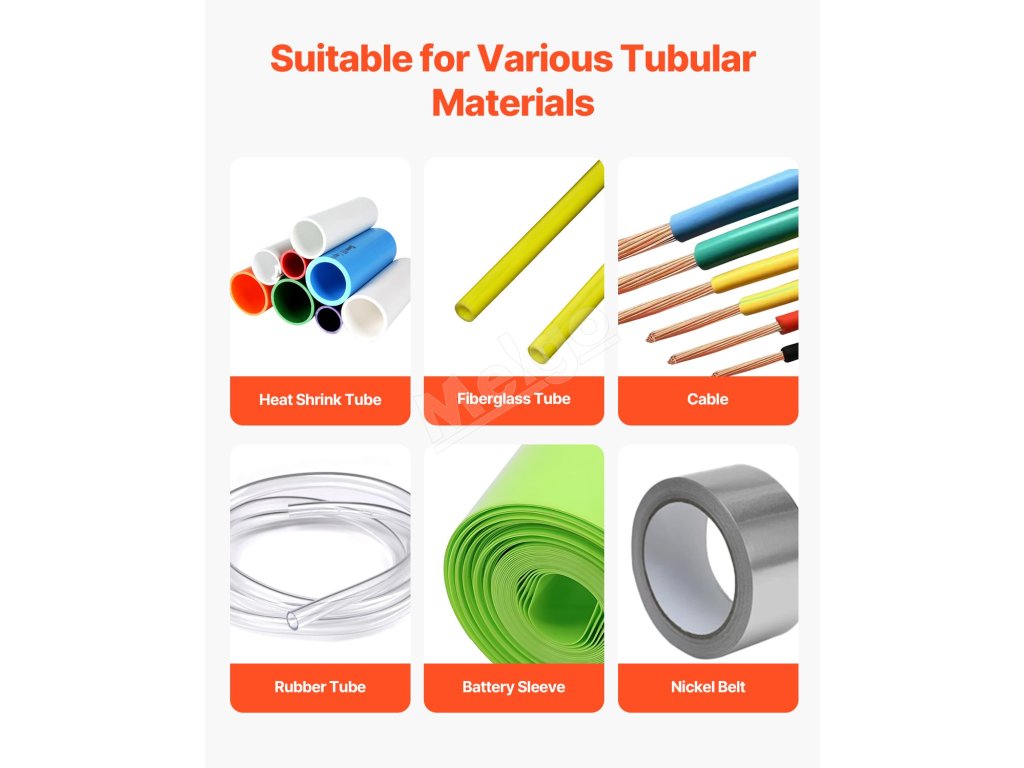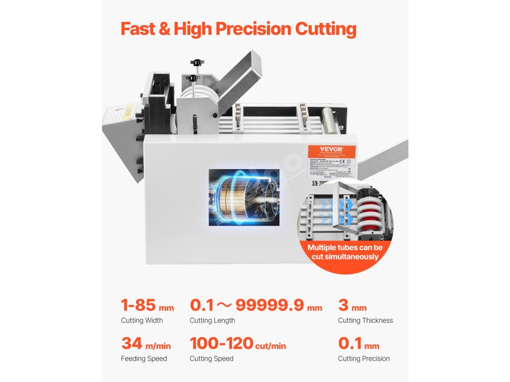 Tento automatický stroj na rezanie teplom zmršťovaných rúrok ponúka efektívne a presné rezanie viacerých rúrok. Má šírku rezu 1 85 mm, dĺžku rezu 0,1 mm až 99999,9 mm, automatické ovládanie, užívateľsky prívetivý ovládací panel a vysokorýchlostný oceľový nôž SKD2, ktorý zabezpečuje spoľahlivý výkon.