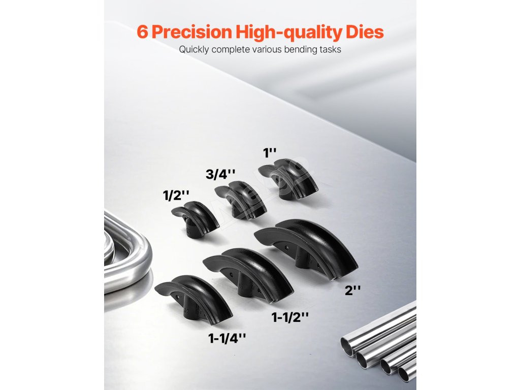 Tento ťažký nástroj na ohýbanie rúr sa dodáva so 6 presnými liatymi matricami vo veľkostiach 1/2", 3/4", 1", 1-1/4", 1-1/2" a 2". Okrem toho sú valce nastaviteľné v 6 úrovniach, aby sa prispôsobili rôznym uhlom ohýbania rúr.