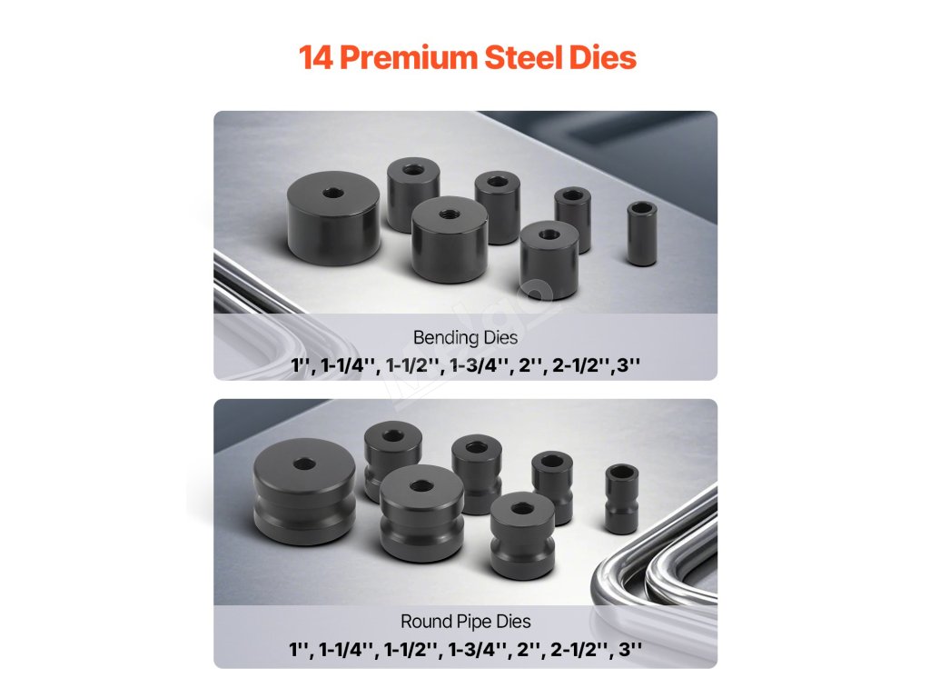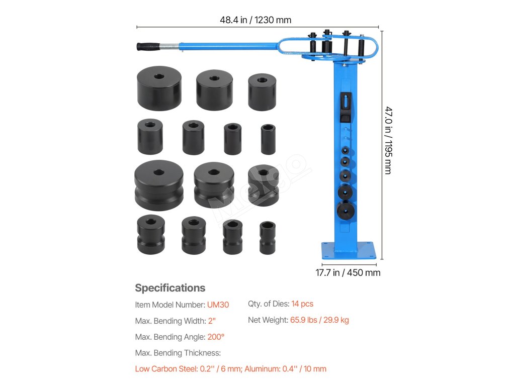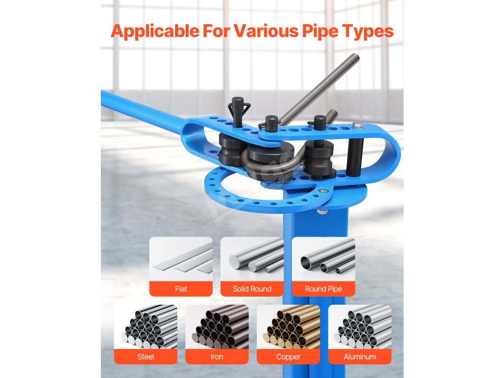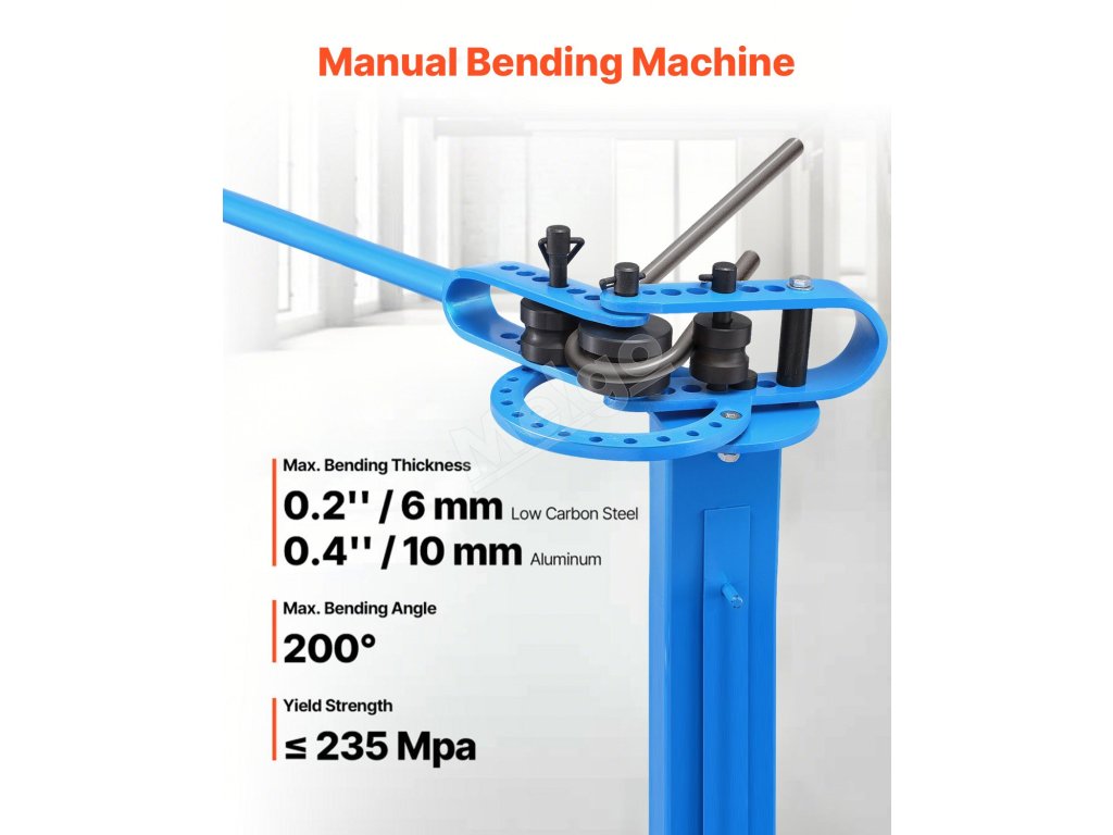 Táto ručná ohýbačka podporuje až 2-palcové ploché oceľové alebo oceľové plechy, duté kruhové rúry s priemerom 0,65 palca a kruhové oceľové tyče s priemerom 1 palec. Dokáže hladko ohýbať nízkouhlíkovú oceľ s hrúbkou do 0,2'' a hliník s hrúbkou do 0,4'', pričom maximálny uhol ohybu je 200 stupňov