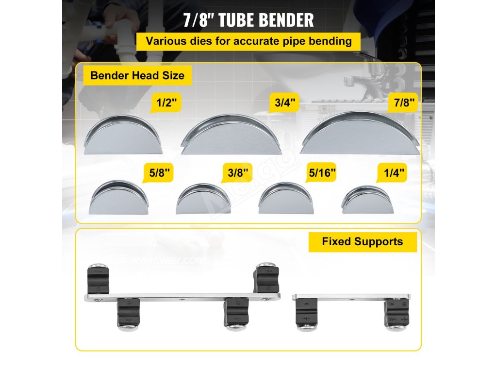 Veľkosti 7 ohýbačiek rúr sú 1/4", 5/16", 3/8", 1/2", 5/8", 3/4", 7/8". A rôzne matrice budú spĺňať vaše drahé ohýbanie.