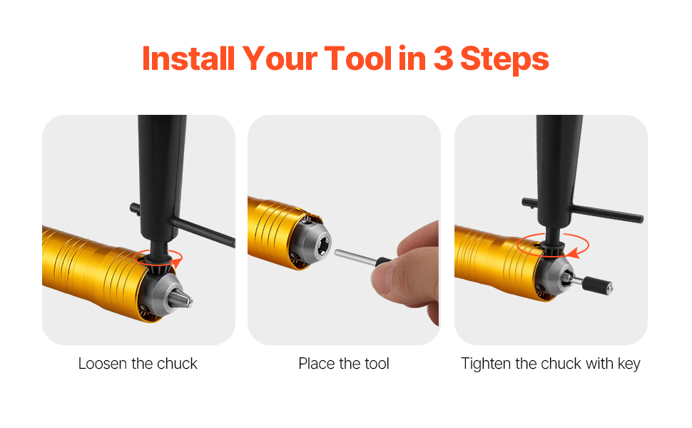 Trojčeľusťové skľučovadlo na špičke tejto závesnej brúsky umožňuje jednoduché nasadenie a vybratie nástrojov, pričom sa prispôsobí veľkostiam od 0,02 do 0,24 palca pre všestranné potreby spracovania.