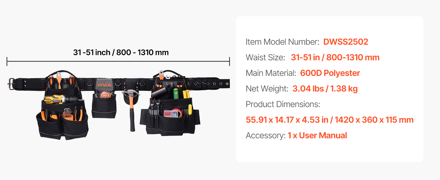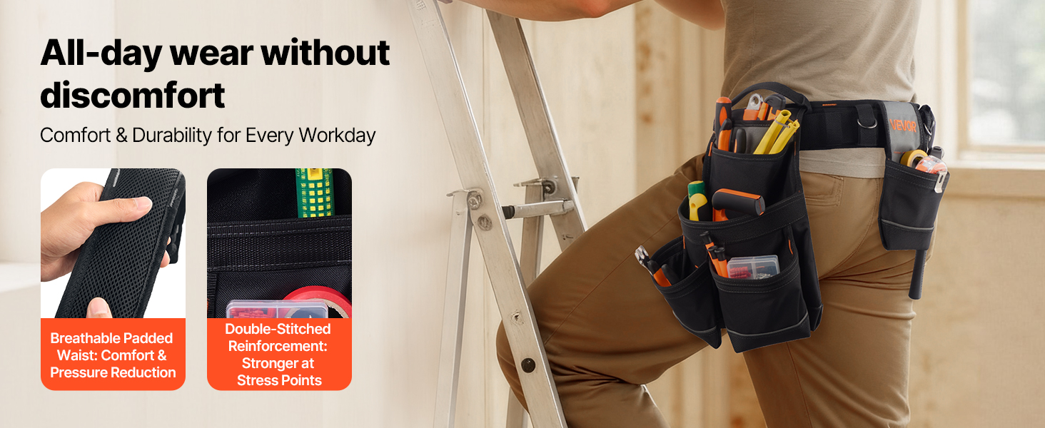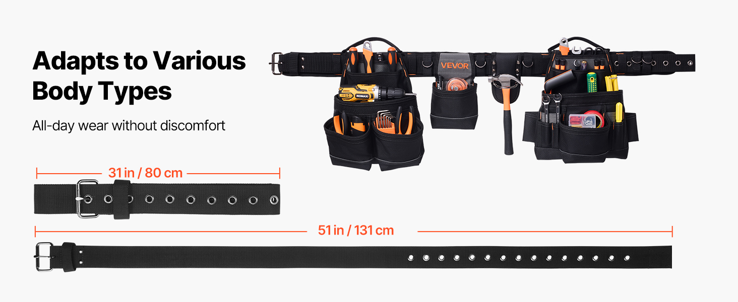 Tento rozšírený, zosilnený opasok na tesárske náradie má ergonomicky navrhnutý pás s nastaviteľnými prackami na rovnomerné rozloženie hmotnosti, čo znižuje námahu po dlhej práci. Zostaňte v pohodlí bez tlaku alebo otlakov v páse po celý deň.