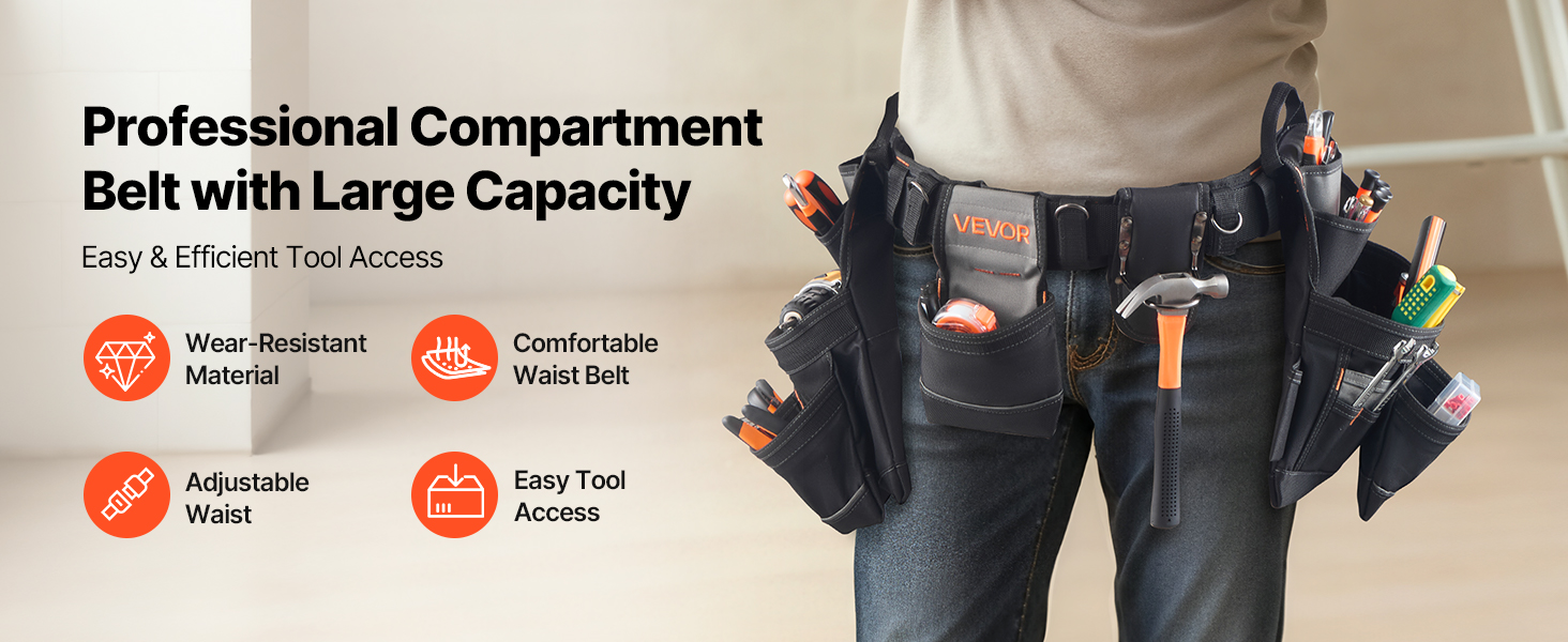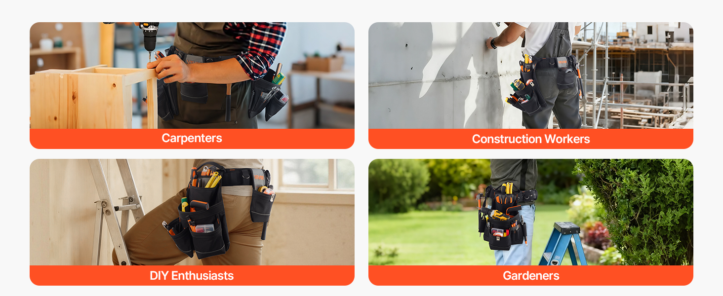 Ideálny pre profesionálnych remeselníkov, stavebných robotníkov alebo domácich majstrov. Tento opasok na stavebné náradie je vhodný na domáce dekorácie, záhradkárske práce, opravy elektrických zariadení a prácu s drevom, vďaka čomu je prístup k náradiu efektívny a pohodlný.