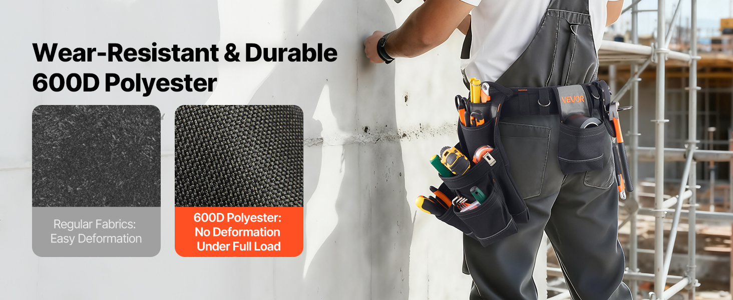 Tento opasok na rámovanie náradia je vyrobený z polyesteru 600D a je odolný voči opotrebovaniu a roztrhnutiu, takže vydrží dlho. Bezpečne drží klince a elektrické náradie bez deformácie alebo poškodenia, čo zaručuje stabilný a spoľahlivý výkon.
