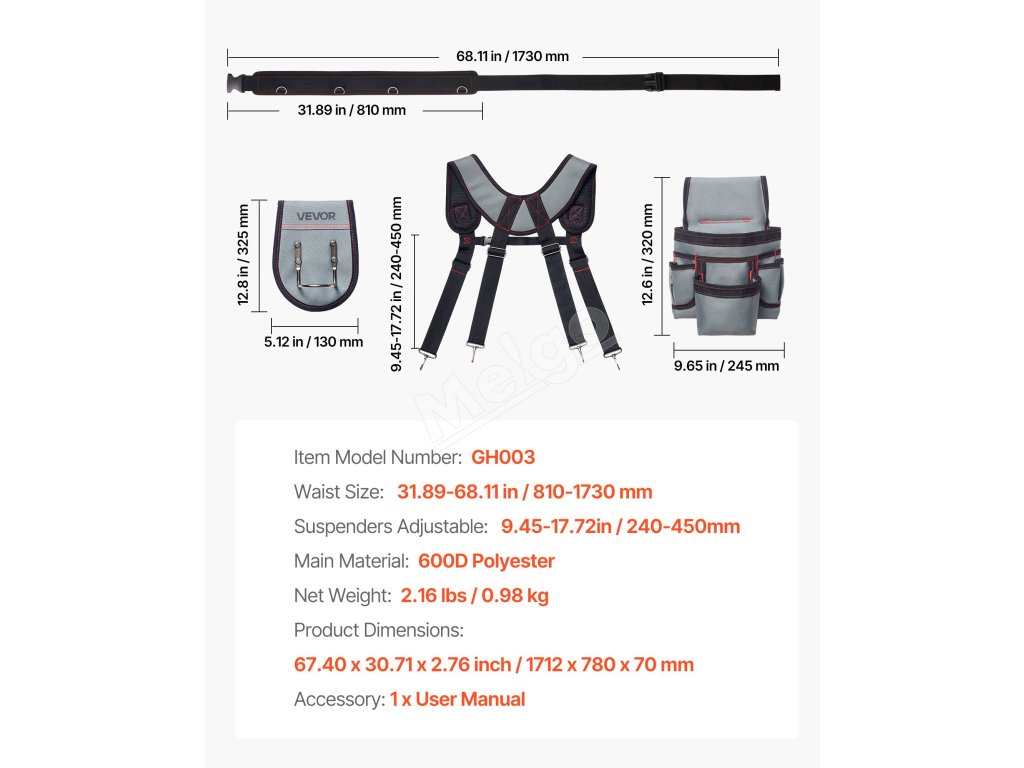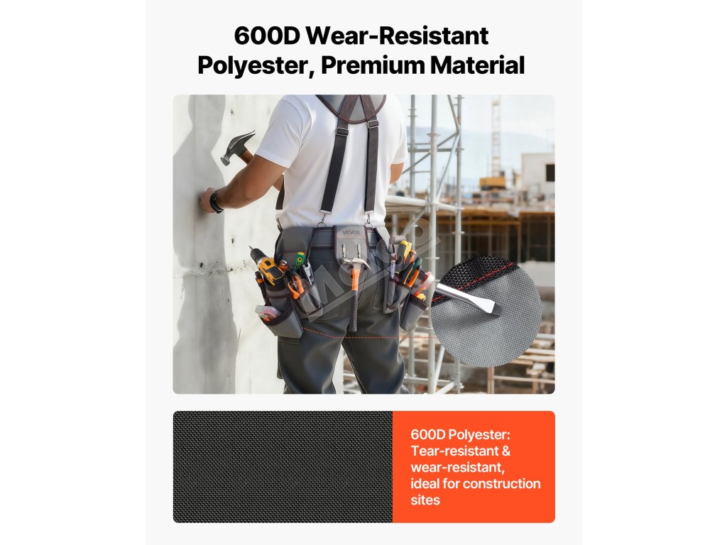 Tento opasok na náradie pre tesárov je vyrobený z polyesteru 600D a odoláva opotrebeniu a roztrhnutiu, takže vydrží dlho. Bezpečne drží klince a elektrické náradie bez deformácie alebo poškodenia, čím zabezpečuje stabilný a spoľahlivý výkon.