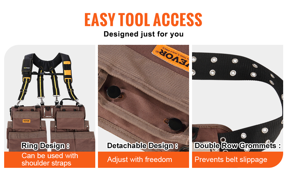Naše vrecko na opasok na náradie je vybavené odnímateľnými vreckami navrhnutými tak, aby zodpovedali vášmu pracovnému štýlu. Rýchly prístup k náradiu je hračka. Vďaka konštrukcii so závesným krúžkom vás odľahčí od pása a uvoľní vám ruky pre maximálnu efektivitu.