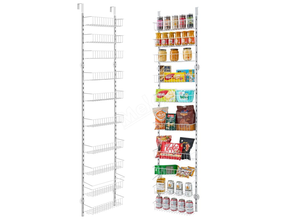 Závesný organizér na dvere špajzy, 10 políc, oceľ, nastaviteľný, biely