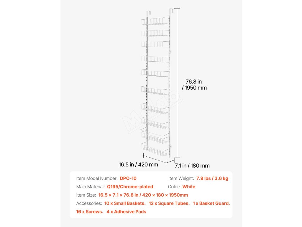 Tento organizér do špajze nad dvere obsahuje 10 veľkých košov, ktoré maximalizujú vašu úložnú kapacitu! Môžete ho použiť ako organizér na dvere špajze, stojan na korenie alebo organizér na skladovanie v skrini - ideálny pre malé priestory.