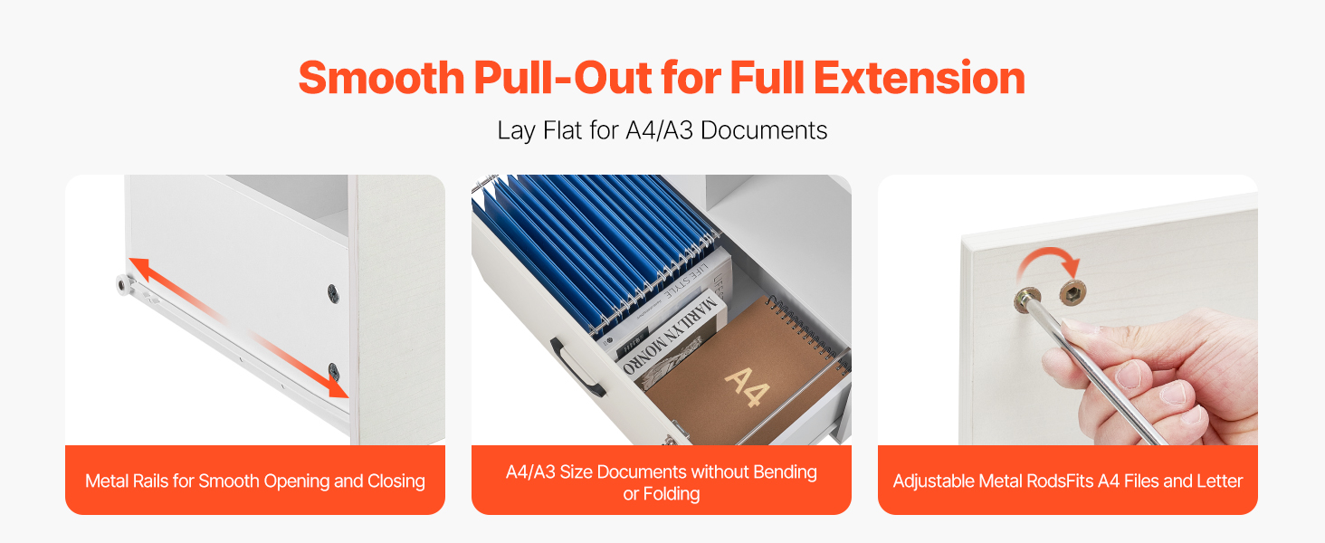 Kovové posuvné koľajničky umožňujú plné vysunutie zásuviek pre bezproblémový prístup, zatiaľ čo do priestranného interiéru sa zmestia dokumenty formátu A4 alebo A3 v rovine bez pokrčenia. Robustná konštrukcia zvládne veľké zaťaženie, čo je ideálne na ukladanie objemných predmetov.