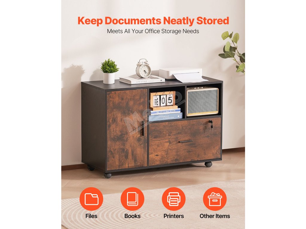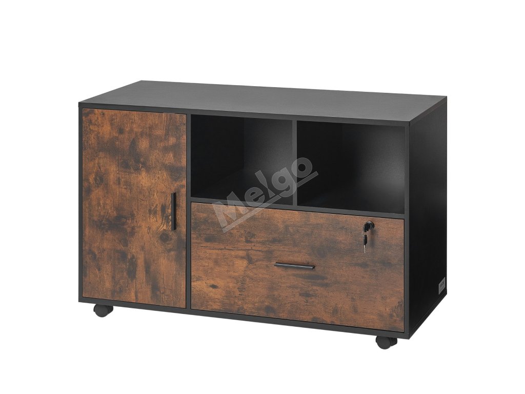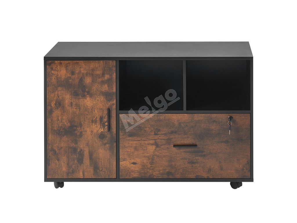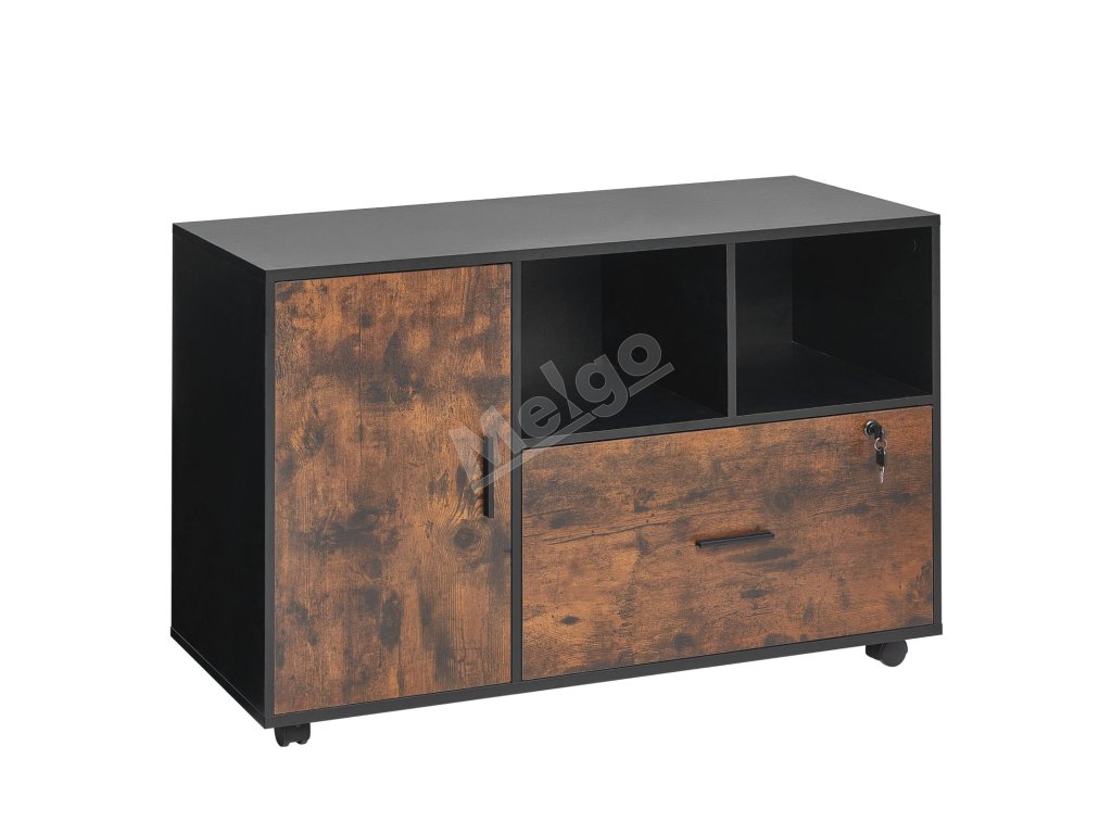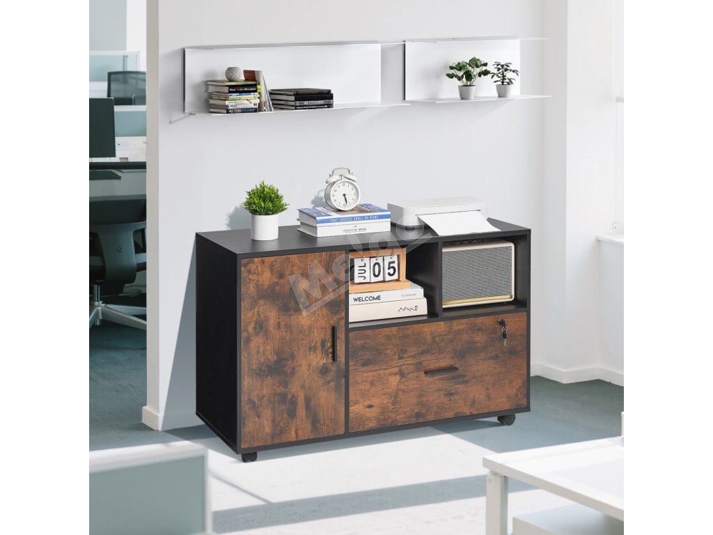Drevená pojazdná skrinka na súbory, otvorené police, zamykateľná, hnedá