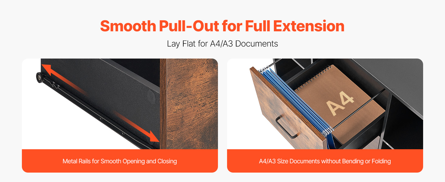 Kovové posuvné koľajničky umožňujú plné vysunutie zásuviek pre bezproblémový prístup, zatiaľ čo do priestranného interiéru sa zmestia dokumenty formátu A4 alebo A3 v rovine bez pokrčenia. Robustná konštrukcia zvládne veľké zaťaženie, čo je ideálne na ukladanie objemných predmetov.