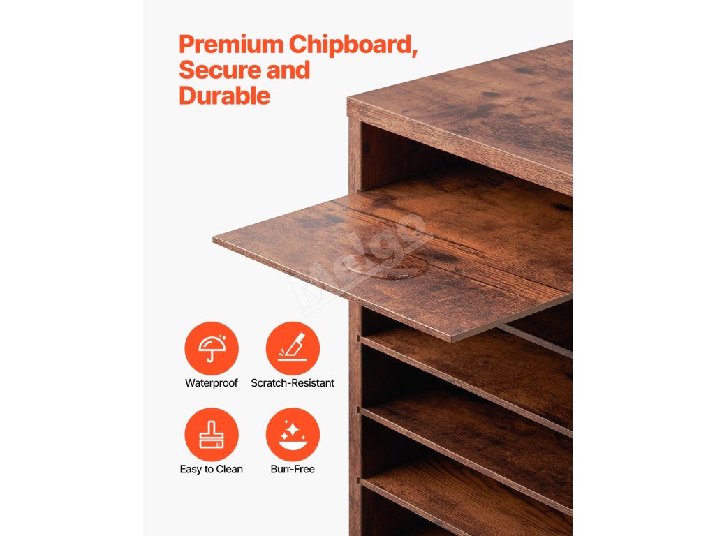 Náš drevený organizér na literatúru je vyrobený z odolnej drevotrieskovej dosky P2 a má certifikát EPA, čo zaručuje jeho bezpečné používanie pre vás a vašu rodinu. Hladký, leštený povrch je vodoodolný, odolný proti poškriabaniu a ľahko sa čistí, takže je ideálny na rušné pracoviská.