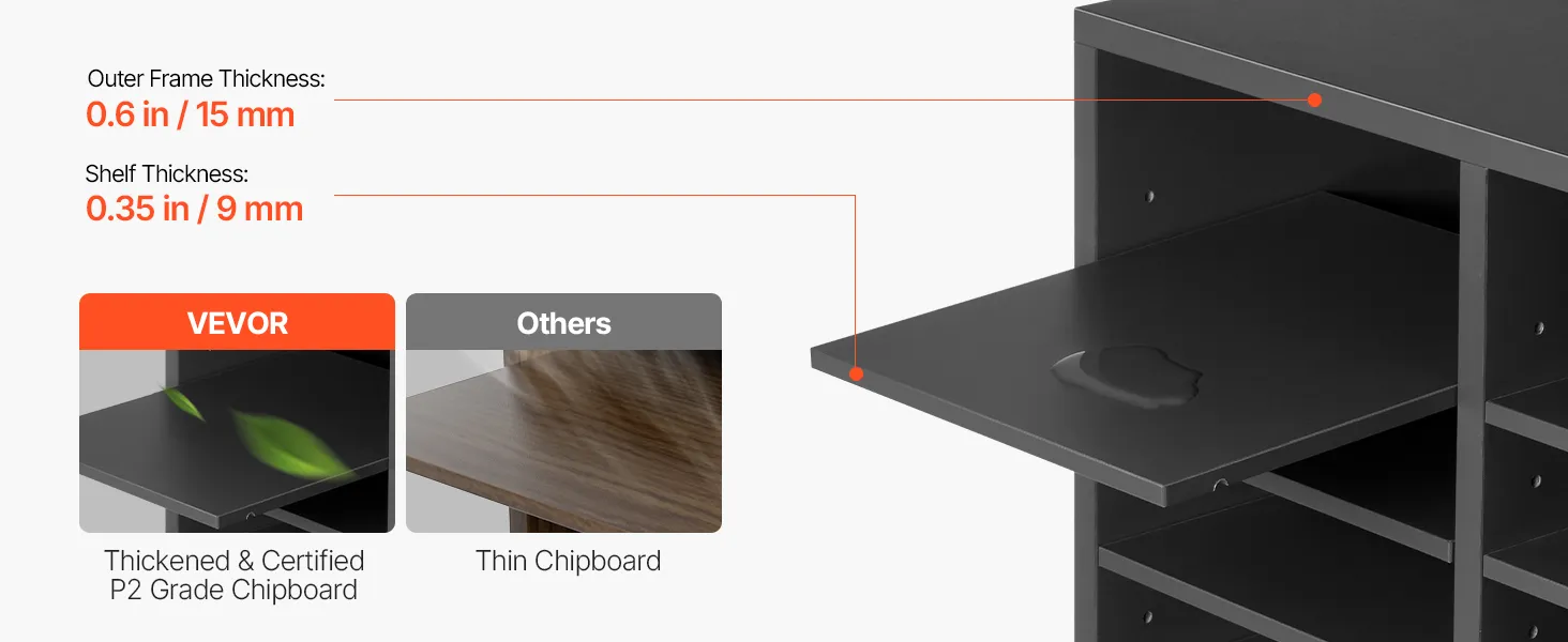 Náš drevený organizér na literatúru je vyrobený z odolnej drevotrieskovej dosky P2 a MDF a má certifikát EPA, čo zaručuje jeho bezpečné používanie pre vás a vašu rodinu. Hladký, leštený povrch je vodoodolný, odolný proti poškriabaniu a ľahko sa čistí, takže je ideálny pre rušné pracoviská.