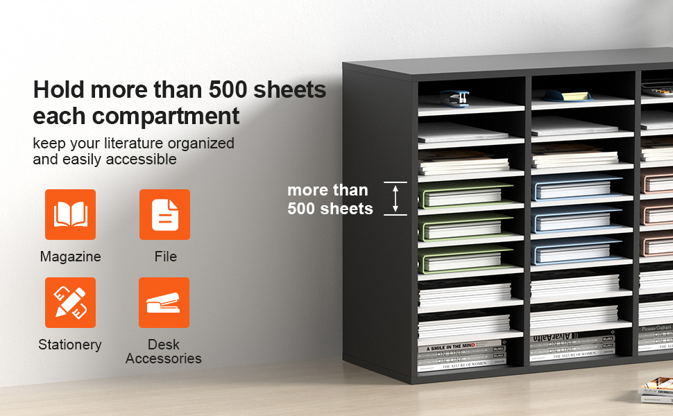 Celkovo 27 priehradiek umožňuje uložiť a usporiadať literatúru, komiksy, spisy, študentské úlohy a dokumenty.