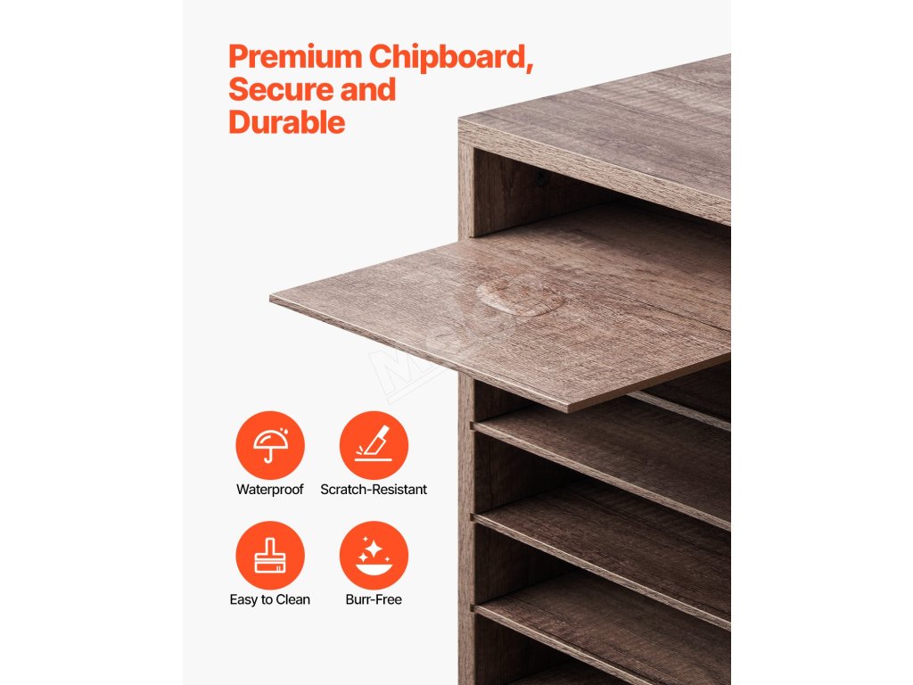 Náš drevený organizér na literatúru je vyrobený z odolnej drevotrieskovej dosky P2 a má certifikát EPA, čo zaručuje jeho bezpečné používanie pre vás a vašu rodinu. Hladký, leštený povrch je vodoodolný, odolný proti poškriabaniu a ľahko sa čistí, takže je ideálny na rušné pracoviská.