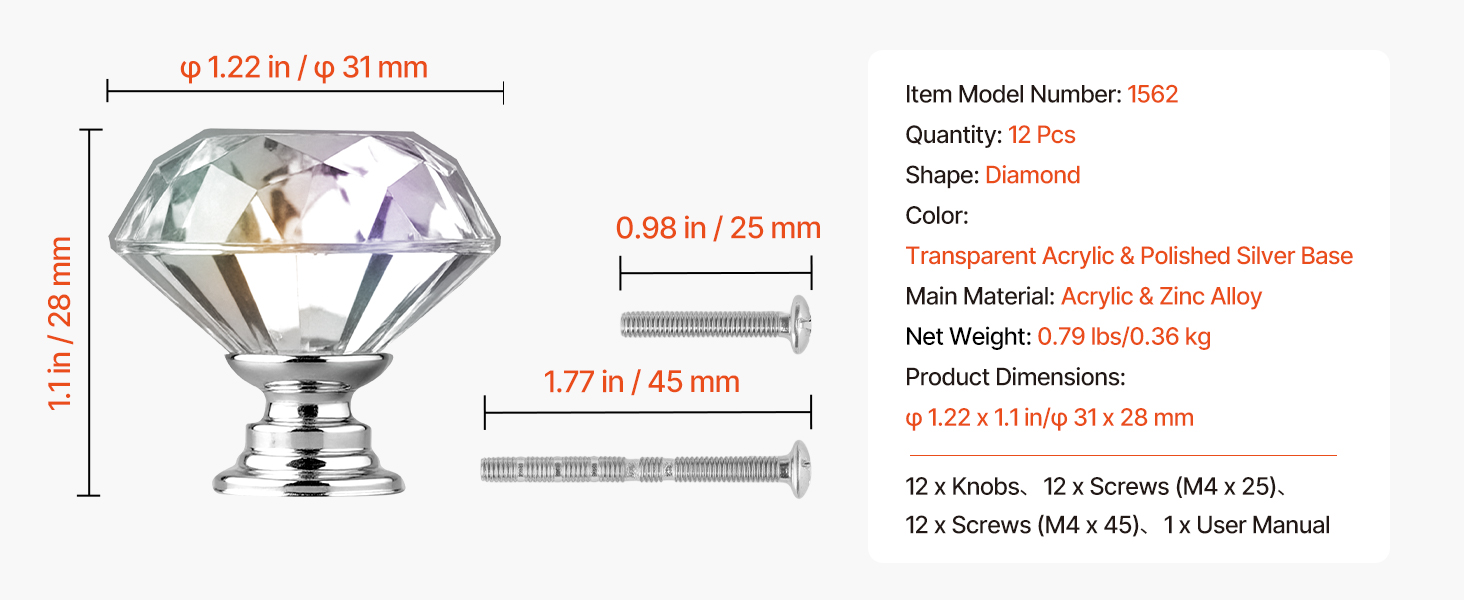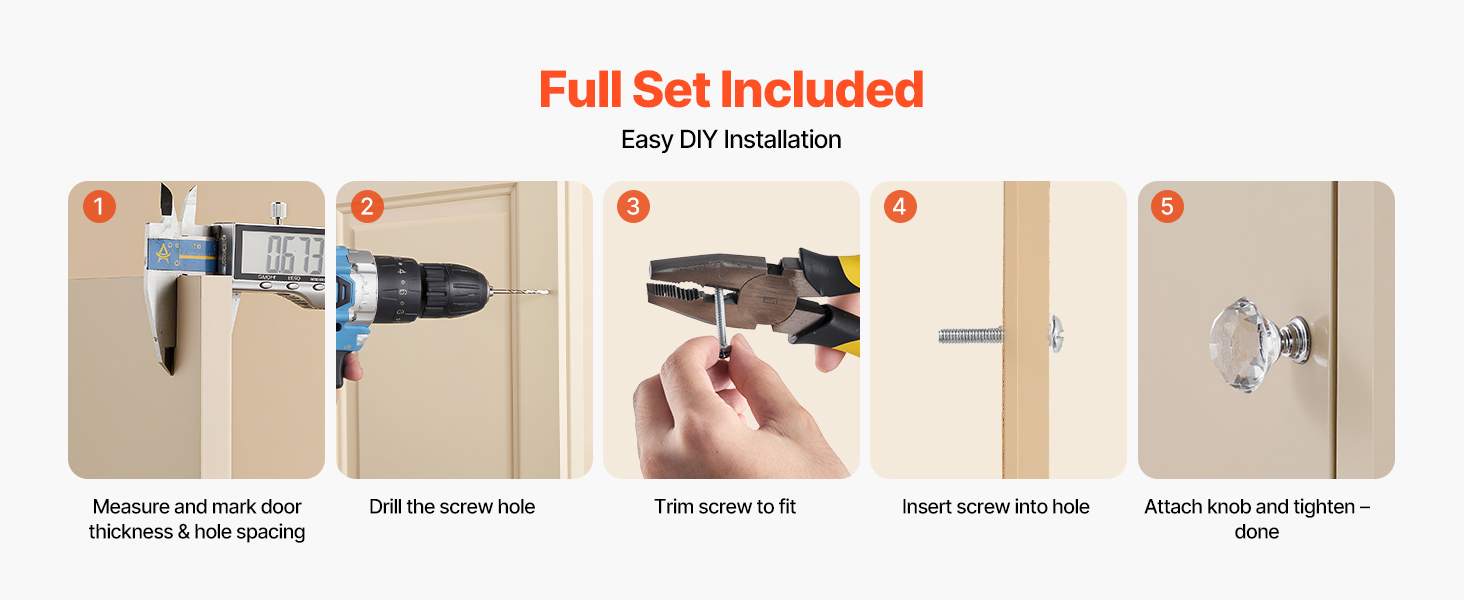 Naše gombíky na komody obsahujú dve veľkosti skrutiek, ktoré sa hodia k rôznym hrúbkam skriniek. Skrutky sa dajú podľa potreby upraviť a ich inštalácia trvá len niekoľko jednoduchých krokov bez potreby špeciálneho náradia.