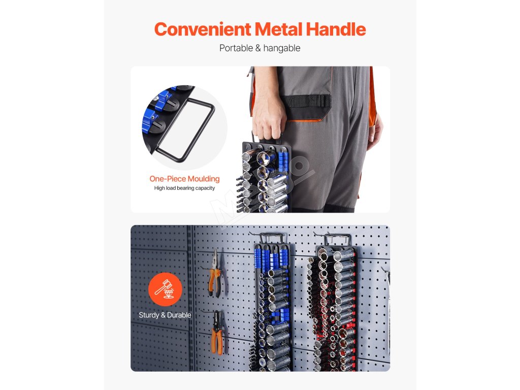 Tento držiak na zásuvky je vybavený praktickou rukoväťou na jednoduché prenášanie a prepravu. Možno ho tiež zavesiť na stenu, aby ste ušetrili miesto a mali náradie usporiadané a dostupné.