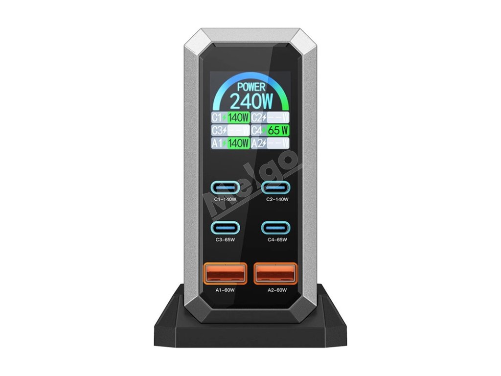 | Výstupný výkon | max. 240 W; typ C1/C2: PD3.1 5V/3A, 9V/3A, 12V/3A, 15V/3A, 20V/5A, 28V/5A; PPS: 3,3-21V/5A 140W(Max); C1+C2: 100W+65W; Typ-C3/C4: 5V/3A,9V/3A,12V/3A,15V/3A,20V/3.25A PPS 3,3-21V/3A 65W(Max); PPS 3,3-21V/3A 65W(Max); C3+C4: 65W+65W; USB-A1/A2: QC3.0 5V/3A,9V/3A,12V/3A,20V/3A 60W(Max); A1+A2: 15W+15W |