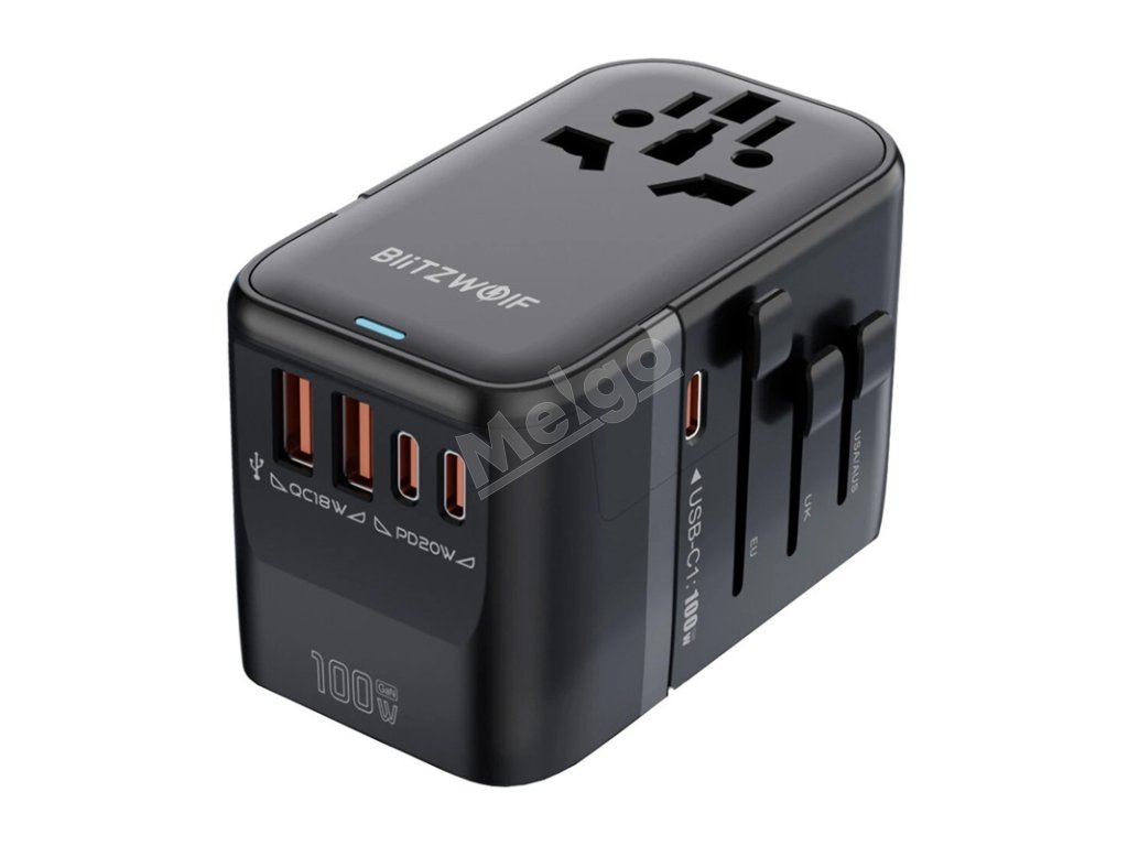 Blitzwolf BW-TA2 cestovný adaptér 5 v 1 2xUSB PD + 2xC QC + C GaN 100W.