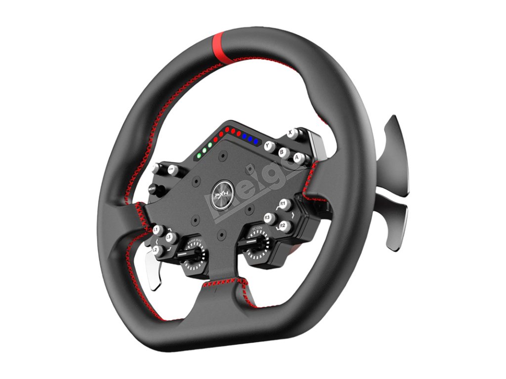 Volant ponúka 11 prispôsobiteľných RGB LED diód, ktoré môžu fungovať ako indikátor otáčok motora alebo svetelný efekt pre väčšie pohltenie. Tlačidlový ovládač s 20 polohami umožňuje rýchle nastavenie vyváženia bŕzd, protiblokovacieho systému ABS alebo kontroly trakcie. Okrem toho je k dispozícii 13 programovateľných tlačidiel, ktoré možno v spojení so softvérom PXN SimRacing ľubovoľne priradiť - od ovládania kamery až po stratégiu v boxoch.