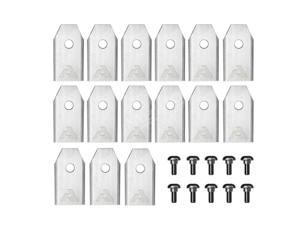 Súprava nožov pre kosiace roboty Anthbot Genie 1000/3000 obsahuje 15 obojstranných nožov z nehrdzavejúcej ocele s titánovou povrchovou úpravou a 10 montážnych skrutiek pre dlhotrvajúcu odolnosť a presné kosenie. Je to praktická súprava, ktorá vám umožní rýchlo vymeniť opotrebované diely a udržiavať váš stroj v optimálnom stave.