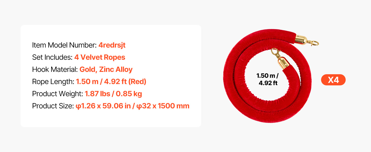 Červené zamatové laná 4 ks, dĺžka 1.5 m, zlaté háky, pre riadenie davu