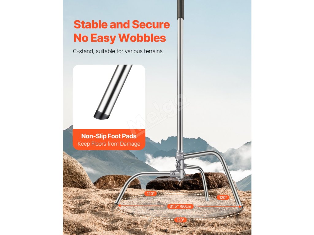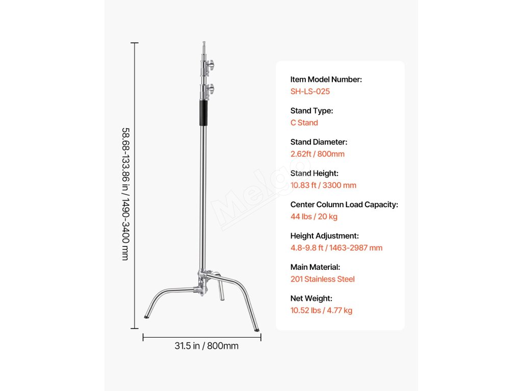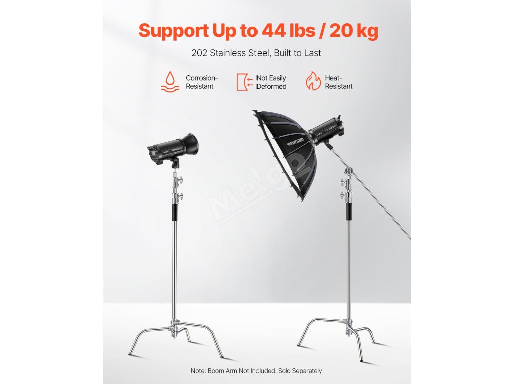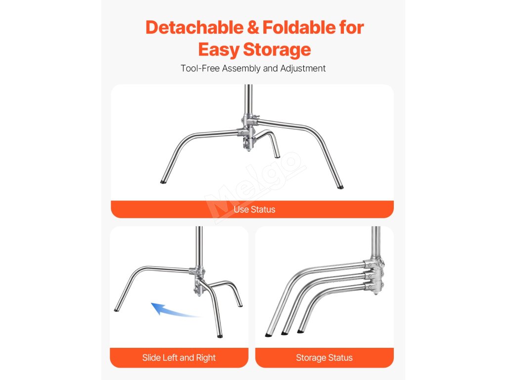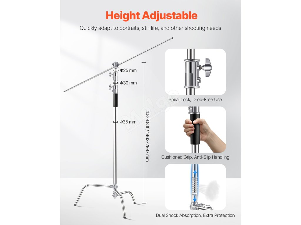 Tento skladací stojan C je vybavený štandardným univerzálnym adaptérom a nosnosťou 44 libier (20 kg), takže bez obáv podporuje video reflektory, softboxy a ďalšie zariadenia. Ľahko nastavte výšku v rozmedzí 4,8 ft až 9,8 ft (1463-2987 mm), aby ste dosiahli ideálny uhol snímania pre akýkoľvek projekt.