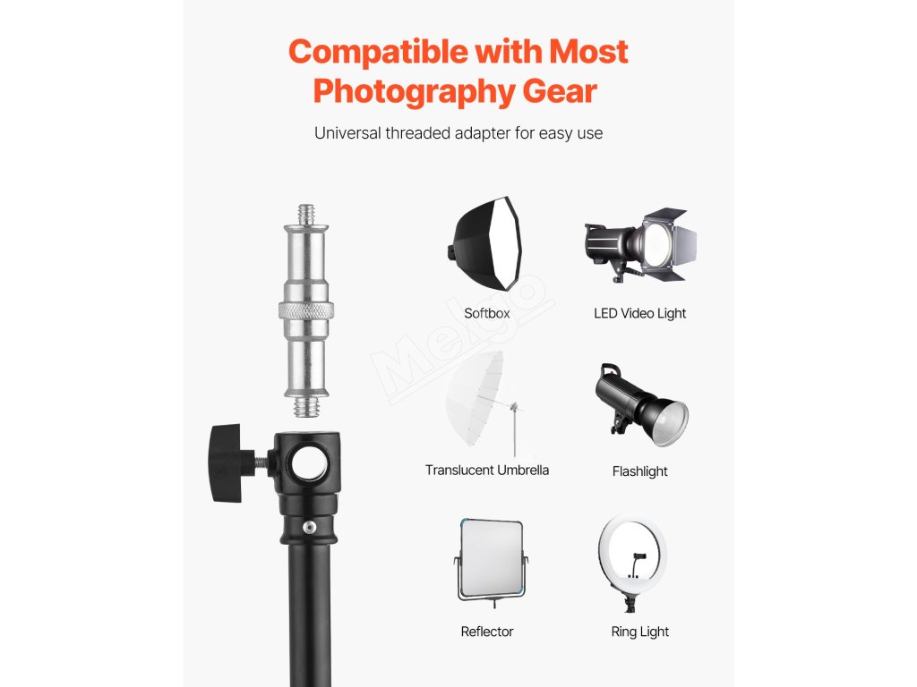 Tento svetelný stojan s ramenom výložníka má univerzálnu konštrukciu adaptéra so závitom, ktorý podporuje skrutku 1/4" aj 3/8". Ľahko sa integruje so širokou škálou fotografického vybavenia a ponúka pohodlnú a praktickú kompatibilitu pre všetky vaše potreby pri fotografovaní.