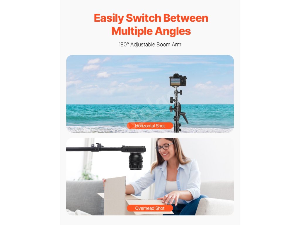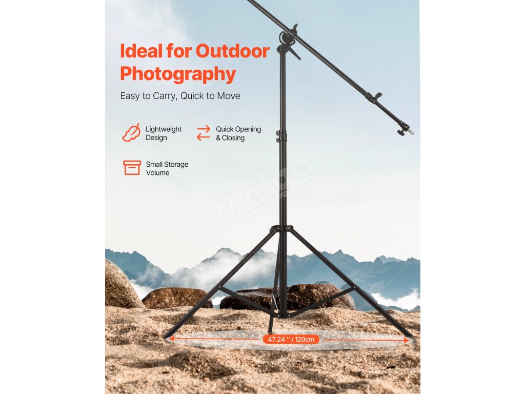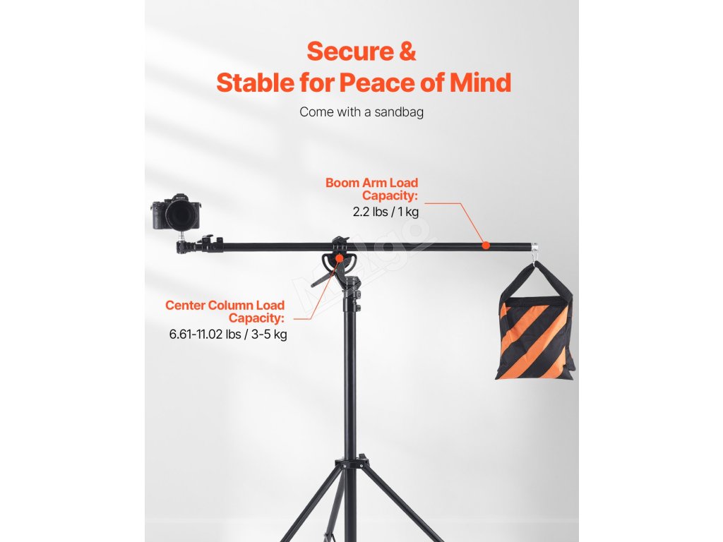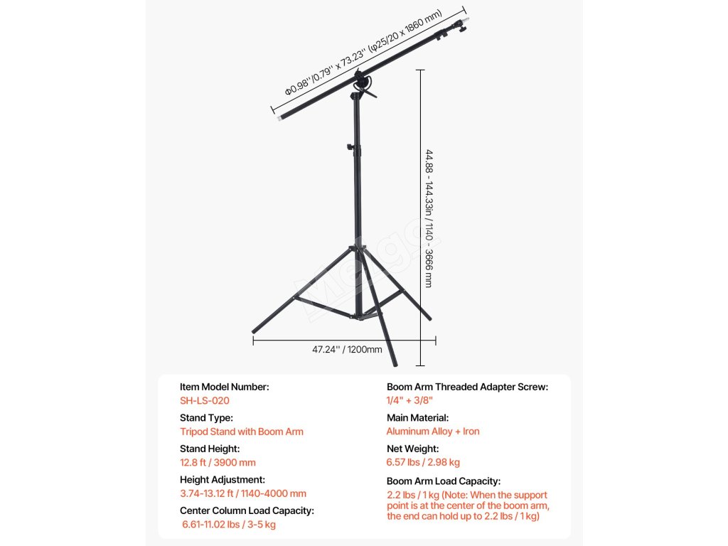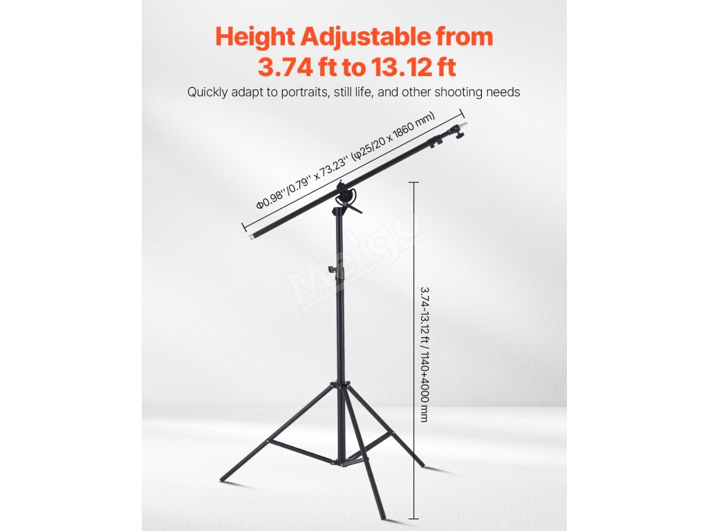 Tento svetelný stojan je vybavený univerzálnym adaptérom so závitom 1/4" a 3/8", ktorý podporuje väčšinu fotografického vybavenia. Vďaka nosnosti stredového stĺpika 6,61 - 11,02 libier, nosnosti ramena výložníka 2,2 libier, nastaviteľnej výške 3,74 - 13,12 stôp a ramenu výložníka nastaviteľnému v uhle 180° vás pokryje.