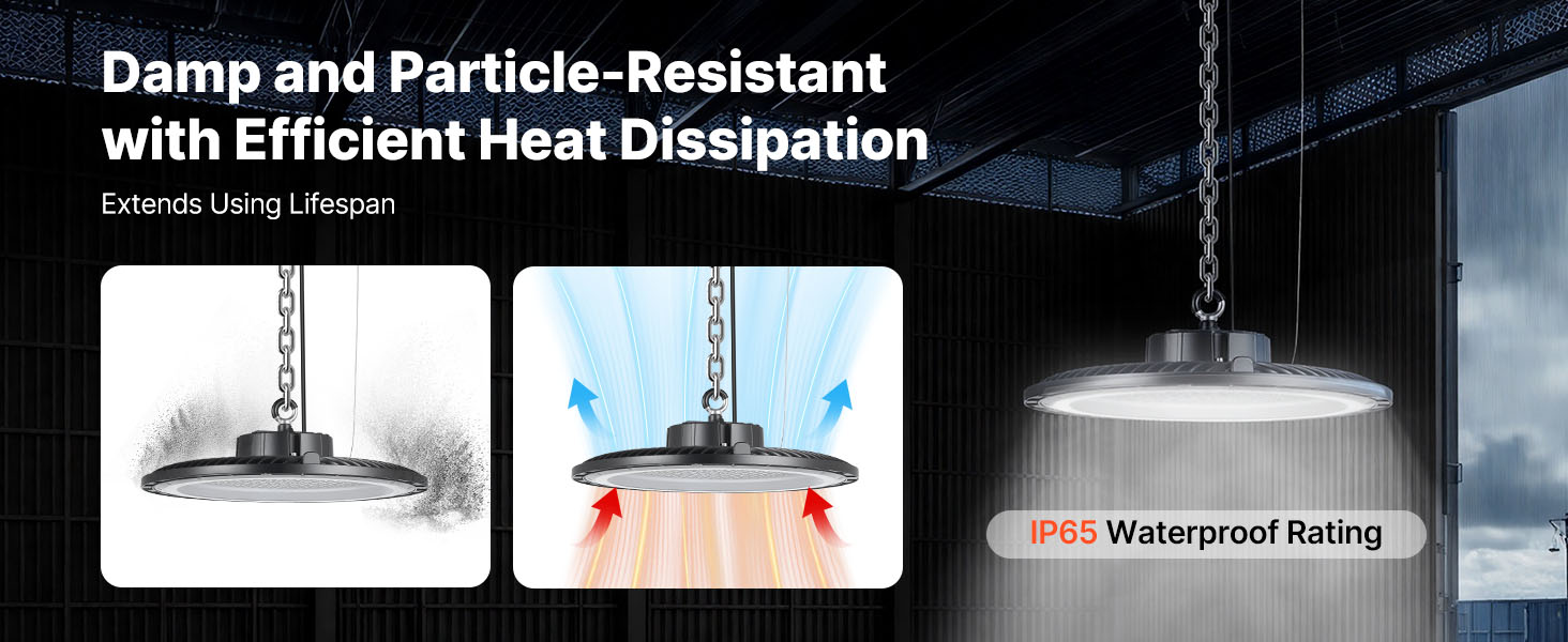 Tieto vysoké svetlá UFO LED sú skonštruované s krytím IP65 a pokročilým systémom odvodu tepla, čo zaručuje stabilný a dlhotrvajúci výkon v horúcich, vlhkých alebo prašných podmienkach, predlžuje životnosť a znižuje potrebu údržby.