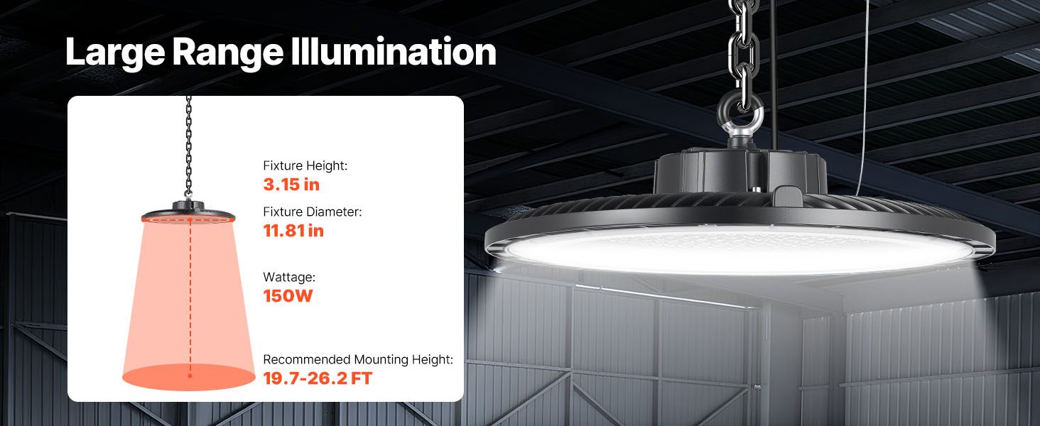 Vďaka kompaktnému priemeru 10,24 palca a výške 4,72 palca umožňujú naše LED svetlá pre vysoké výložníky široké osvetlenie z montážnej výšky 15-18 stôp. Ideálne pre sklady, dielne a parkovacie plochy, osvetľuje každý kút pre lepšiu viditeľnosť, čím zvyšuje efektivitu a bezpečnosť.