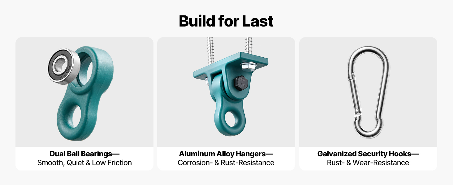 Tieto odolné závesy na hojdačky sú vybavené dvojitými guľôčkovými ložiskami, závesmi z hliníkovej zliatiny a pozinkovanými bezpečnostnými háčikmi pre vyváženú podporu zaťaženia. Sú navrhnuté tak, aby odolávali uvoľňovaniu, hrdzi a opotrebeniu v priebehu času, a pomáhajú udržiavať stabilný a pohodlný výkon hojdačiek na dvore.