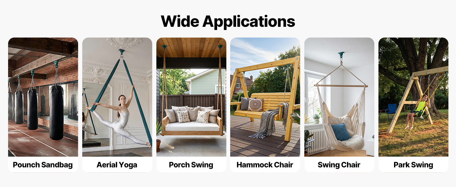 Tieto viacúčelové závesy na hojdačky sa dajú použiť na hojdačky, zariadenia na vzdušnú jógu a boxovacie vrecia. Sú vhodné na použitie v interiéri aj exteriéri a podporujú fitness, hru a relaxáciu – jedno riešenie navrhnuté na rôzne aktivity.