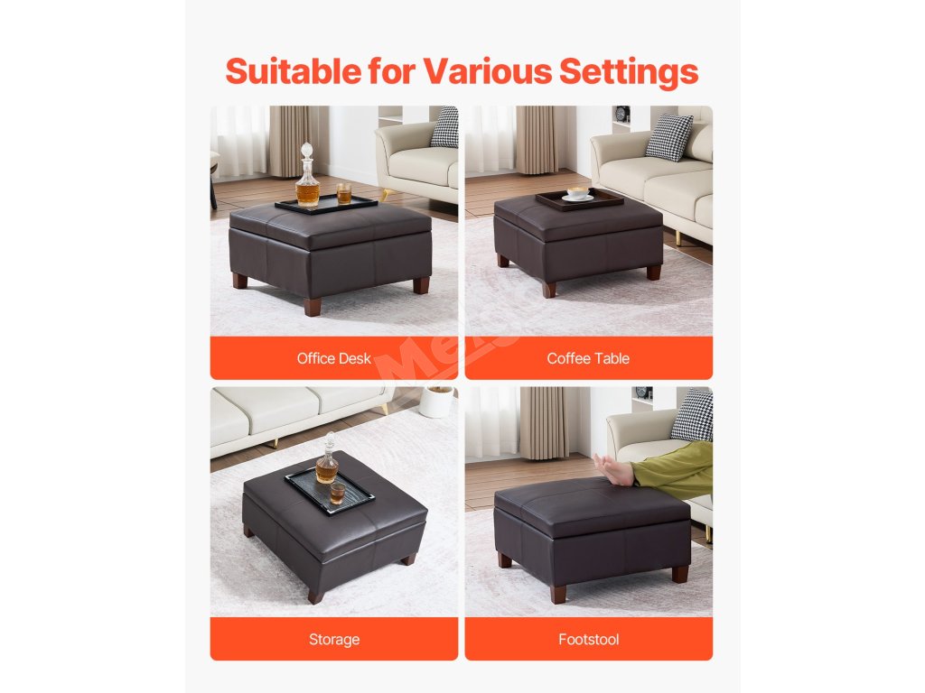 Tento univerzálny kožený otoman s úložným priestorom v sebe spája poriadok a eleganciu. Vďaka skrytému úložnému priestoru vo vnútri a pohodlnému čalúnenému sedadlu v hornej časti sa skvele hodí ako podnožka, úložná truhlica alebo štýlový akcent. Perfektne sa hodí do malých priestorov a moderných domácností.