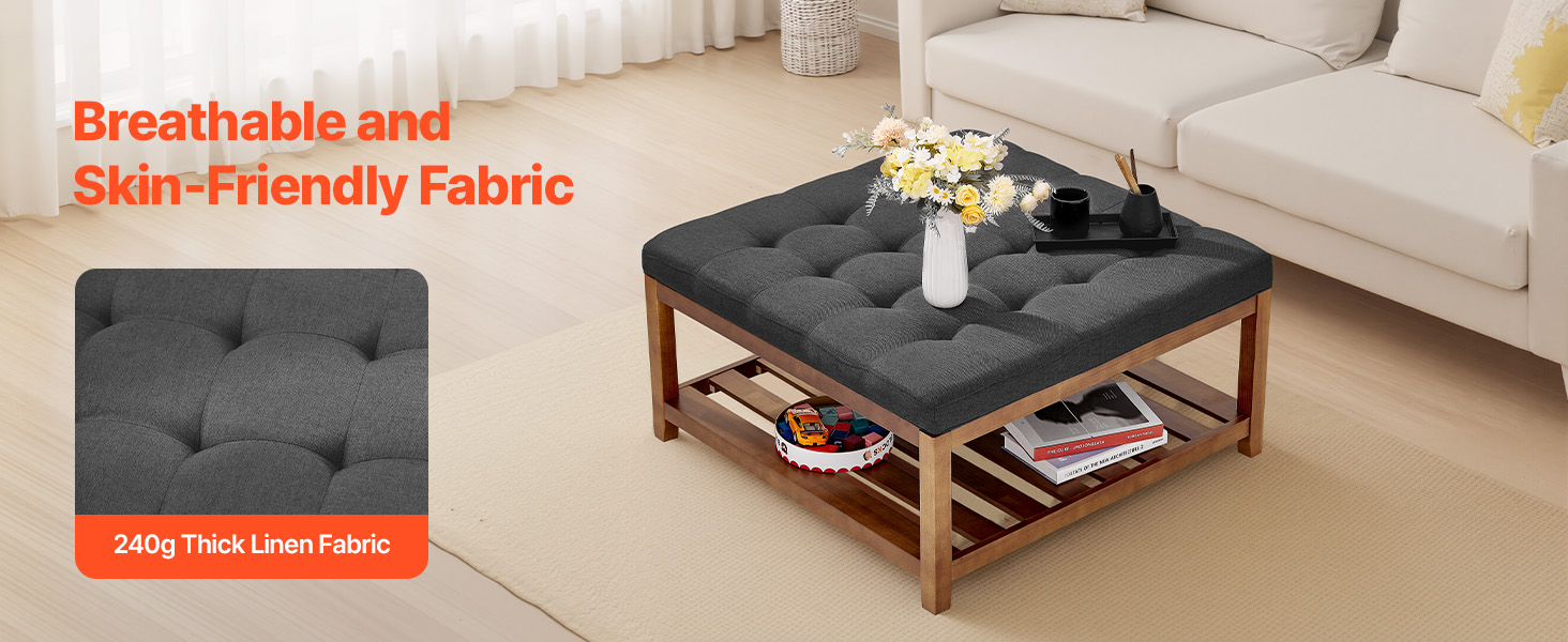 Čalúnený konferenčný stolík je vyrobený z 240 g hrubej ľanovej tkaniny, ktorá je odolná proti roztrhnutiu, opotrebovaniu a neplesnivie. Je priedušná, chladivá a odolná, poskytuje príjemný pocit na pokožke aj pri dlhodobom používaní.