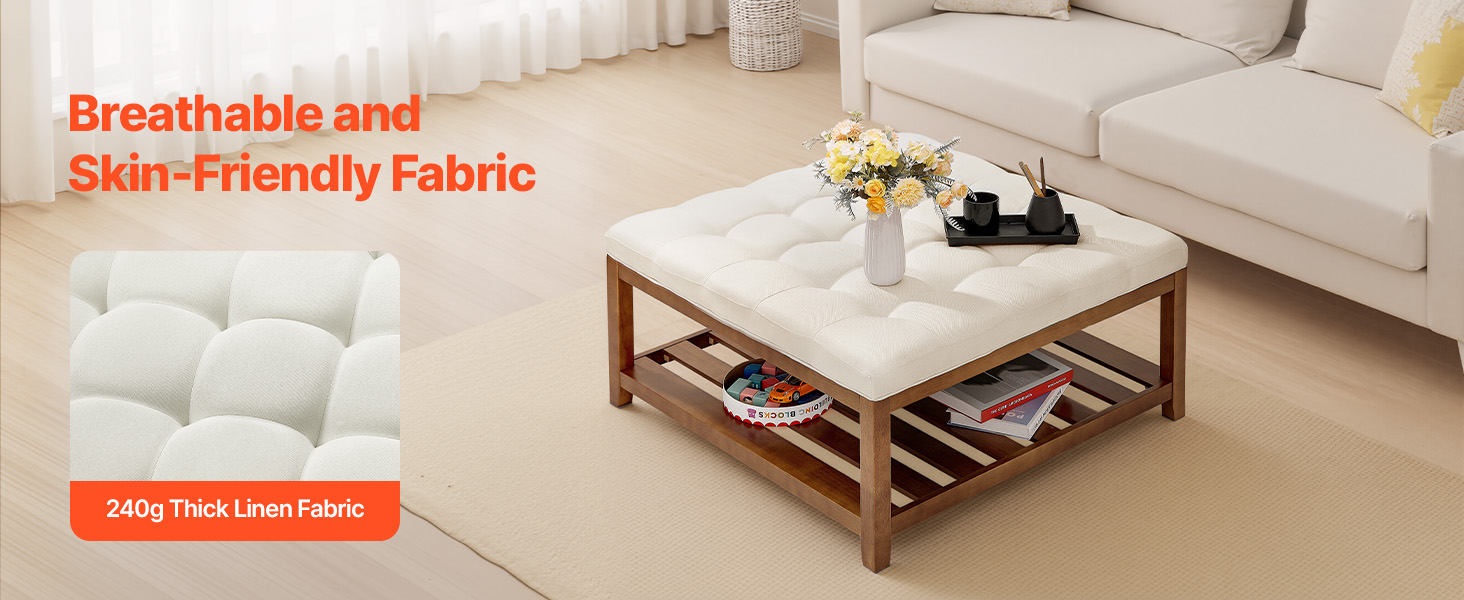 Kombinuje úložný priestor, opierku nôh, sedadlo a konferenčný stolík a unesie až 400 kg. Priedušná ľanová tkanina a hrubý penový vankúš poskytujú pohodlie a odolnosť. Spodný drevený úložný priestor pre ľahký prístup k hračkám, diaľkovým ovládačom a ďalším veciam. Ideálny do malých priestorov.