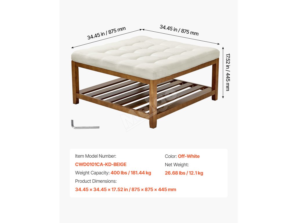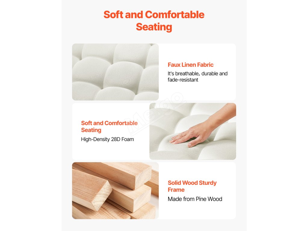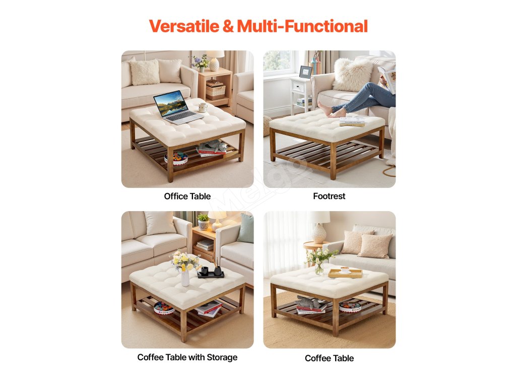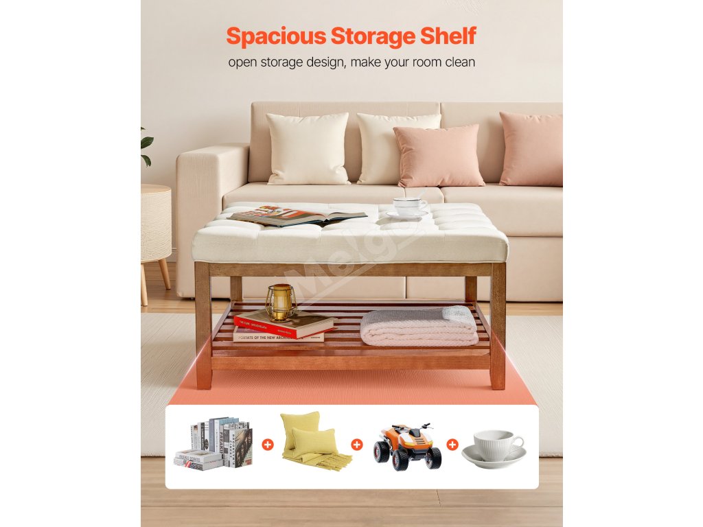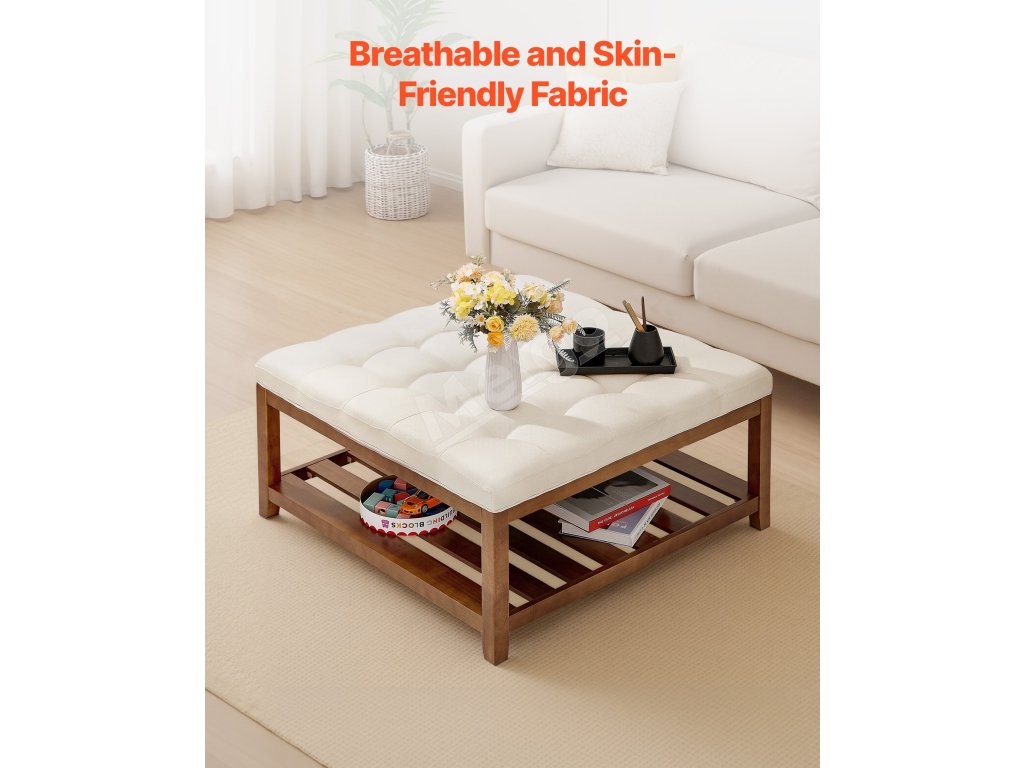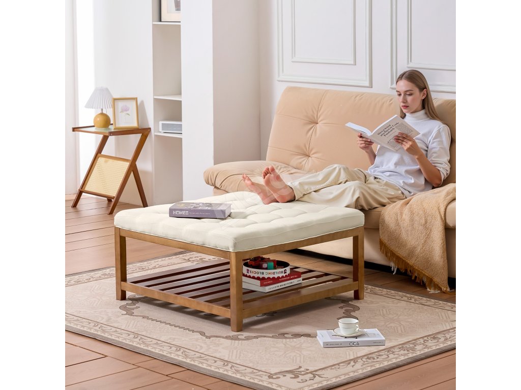 Kombinuje úložný priestor, opierku nôh, sedadlo a konferenčný stolík a unesie až 400 kg. Priedušná ľanová tkanina a hrubý penový vankúš poskytujú pohodlie a odolnosť. Spodný drevený úložný priestor pre ľahký prístup k hračkám, diaľkovým ovládačom a ďalším veciam. Ideálny do malých priestorov.