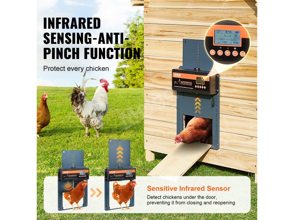 Naša jedinečná infračervená technológia inteligentne rozpozná všetky prekážky počas zatvárania. Keď zistí prekážku, okamžite zastaví dvierka a znovu ich otvorí, čím eliminuje riziko poranenia. Tým je zaistená nielen bezpečnosť kurčiat.