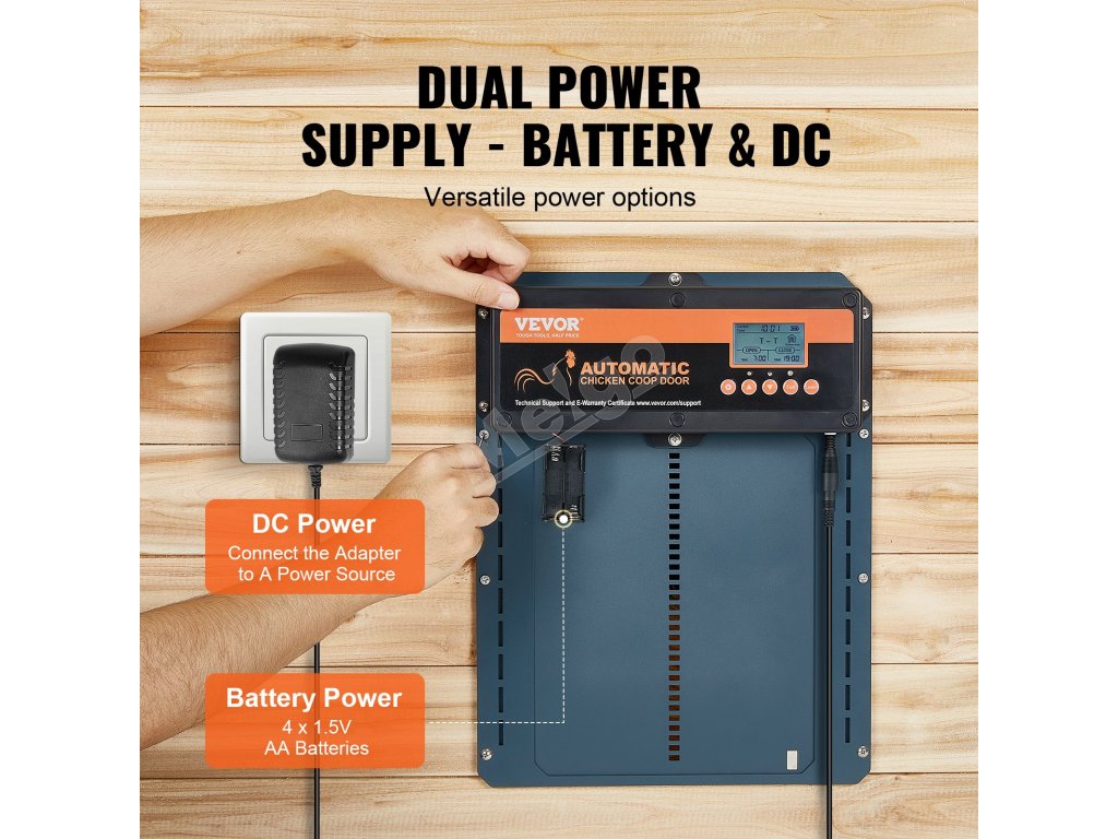 Nemusíte sa obávať vybitých batérií. Náš automatický otvárač dverí pre kurčatá podporuje napájanie z batérií aj jednosmerným prúdom, čím zabezpečuje stály prístup bez stresu z napájania.
