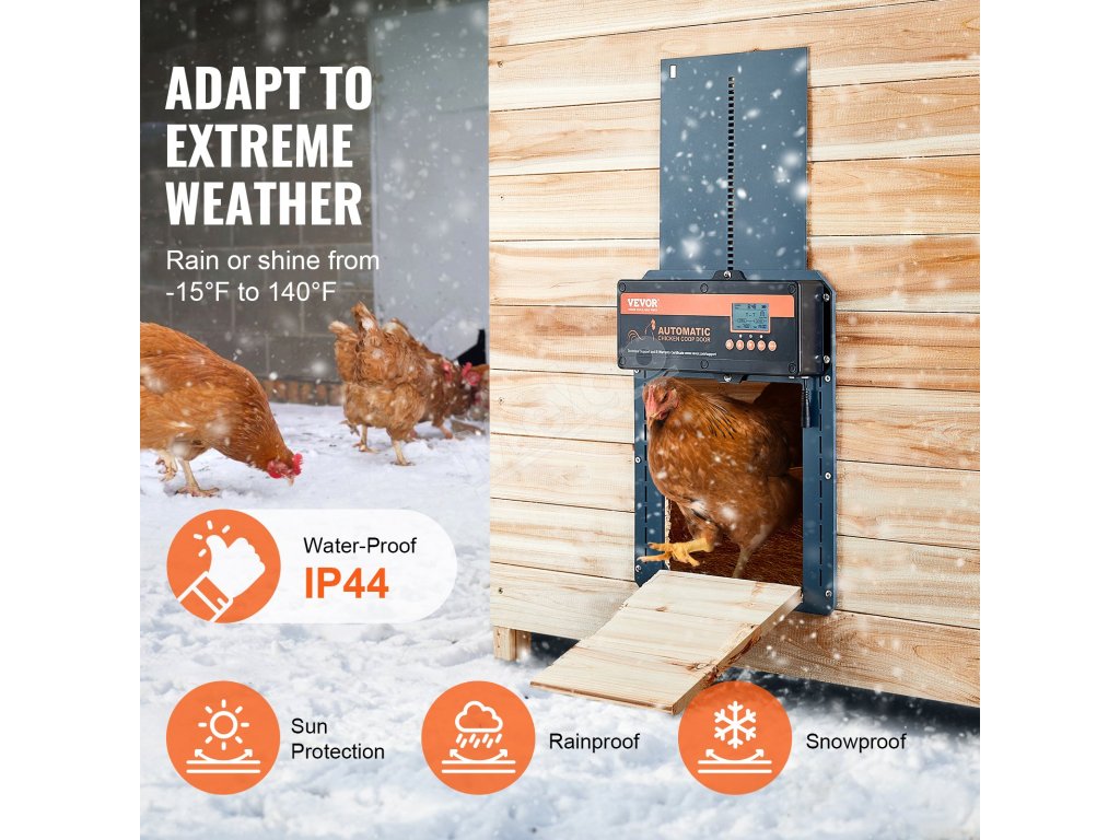 Či už je horúce slnko alebo silný dážď, naše automatické dvierka pre kurčatá zvládnu všetko. Účinne funguje v širokom teplotnom rozsahu, od mrazivých zím až po sparné letá, čím zabezpečuje, že vaše kurčatá nebudú obťažované extrémnymi poveternostnými podmienkami.