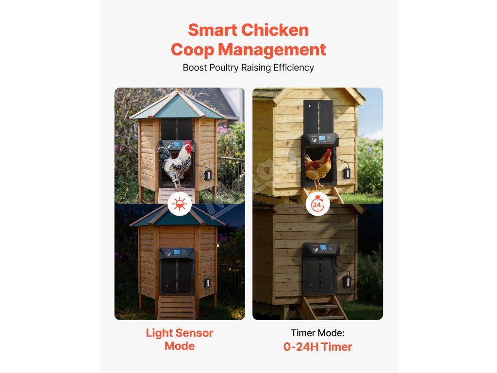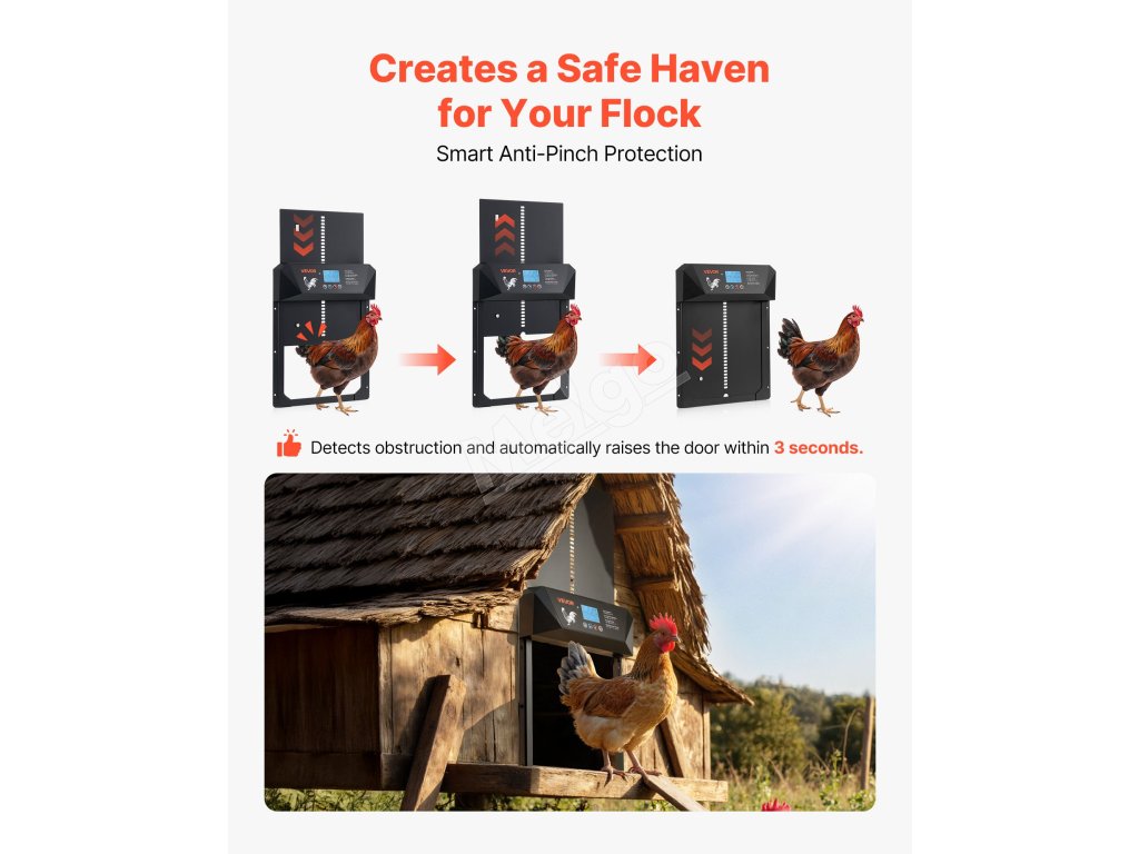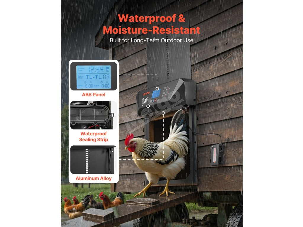 Automatické dvere kurína ponúkajú viacero inteligentných režimov - svetelný senzor, časovač, diaľkové ovládanie a manuálny režim. Konštrukcia proti zakliesneniu zabezpečuje bezpečný vstup a výstup. Vodotesnosť a odolnosť voči vlhkosti pre spoľahlivý výkon v každom počasí a prostredí.