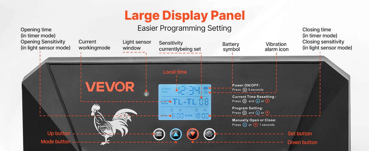 Tieto dvierka pre kurčatá sú vybavené veľkým displejom, ktorý prehľadne zobrazuje čas, stav dverí a plánované nastavenia. Nastavenie časovačov, zmena režimov alebo kontrola stavu je jednoduchá a intuitívna.