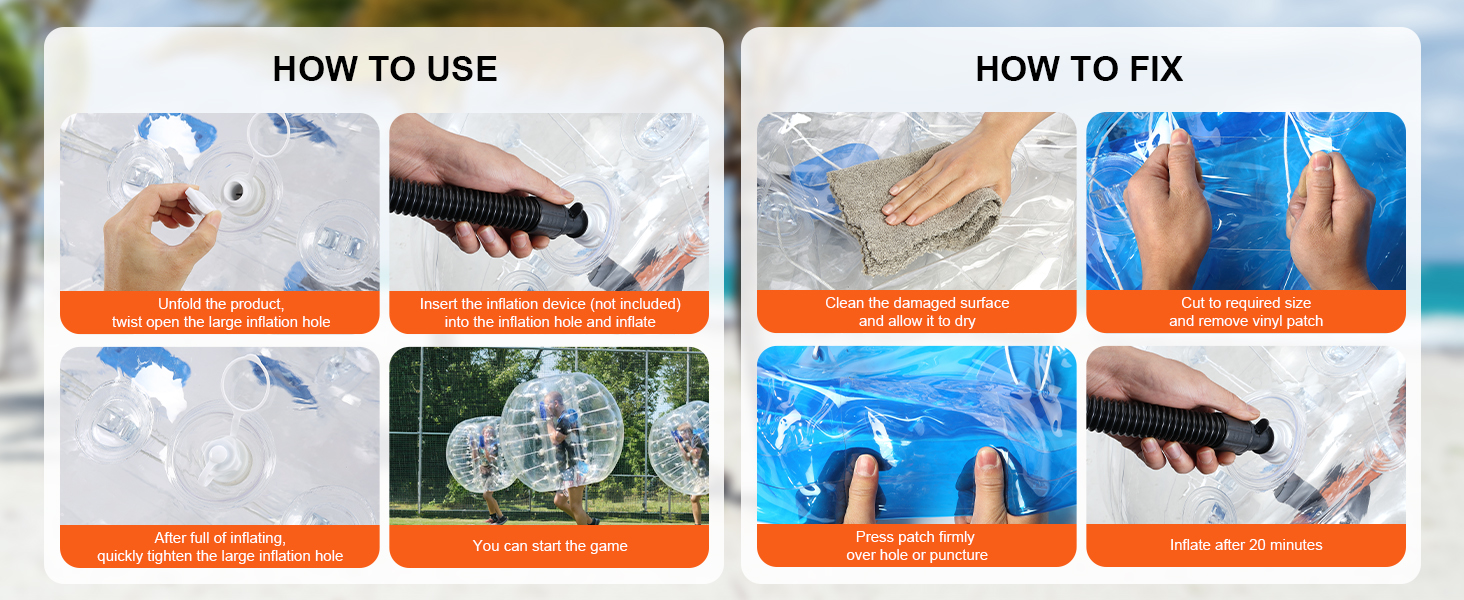 Jednoduché používanie, každá súprava obsahuje podrobný návod na použitie a 2 opravné náplasti. Postup je jednoduchý: jednoducho rozložte výrobok, odskrutkujte veľký nafukovací ventil, nafúknite ho pomocou vzduchovej pumpy (nie je súčasťou balenia) a po úplnom nafúknutí ventil rýchlo utiahnite a začnite hrať.
