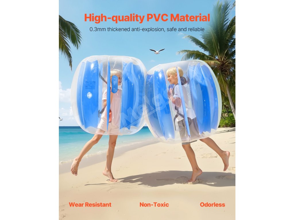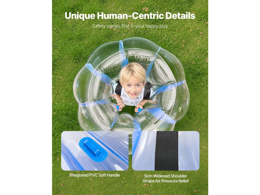 Bublinová lopta na skákanie je vyrobená z vysokokvalitného PVC materiálu a má protiexplozívnu konštrukciu; integrované rukoväte z mäkkého PVC zaisťujú bezpečnosť; hrubé nastaviteľné ramenné popruhy účinne zmierňujú tlak na ramená a poskytujú silný pocit bezpečia.