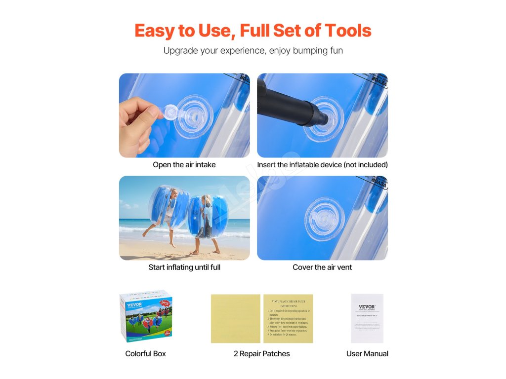 Kompletné vybavenie so všetkými potrebnými nástrojmi, nafúknutie je jednoduché. Stačí postupovať podľa pokynov a v okamihu budete pripravení na hru s hrkálkami.