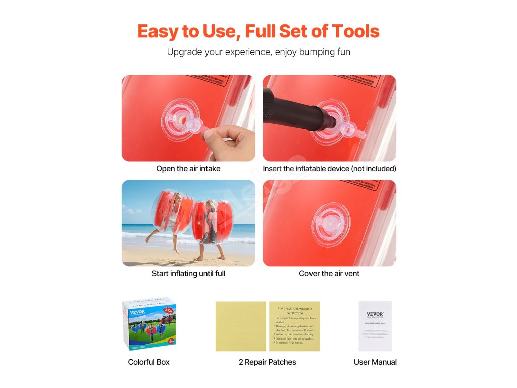 Kompletné vybavenie so všetkými potrebnými nástrojmi, nafúknutie je jednoduché. Stačí postupovať podľa pokynov a v okamihu budete pripravení na hru s hrkálkami.