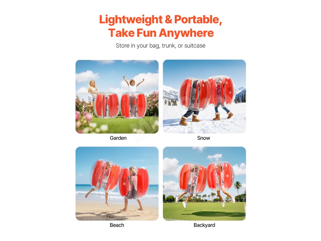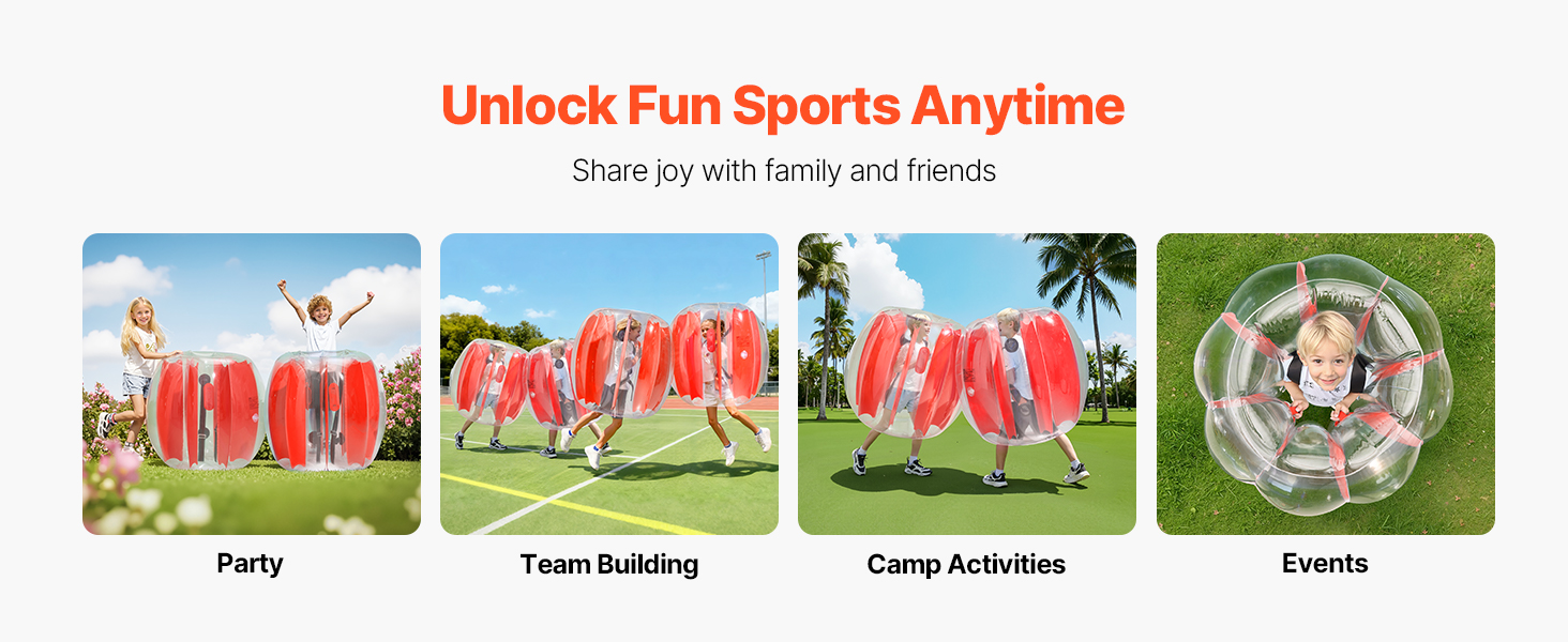 Naše telesné sumo zorbové lopty sú ideálne na zábavu pre jednotlivca alebo viacerých hráčov, vďaka čomu si môžete užívať slobodu pri skákaní, hádzaní, kotúľaní a narážaní. Zabavte sa s rodinou a priateľmi a zároveň si užívajte radosť z fyzickej aktivity.