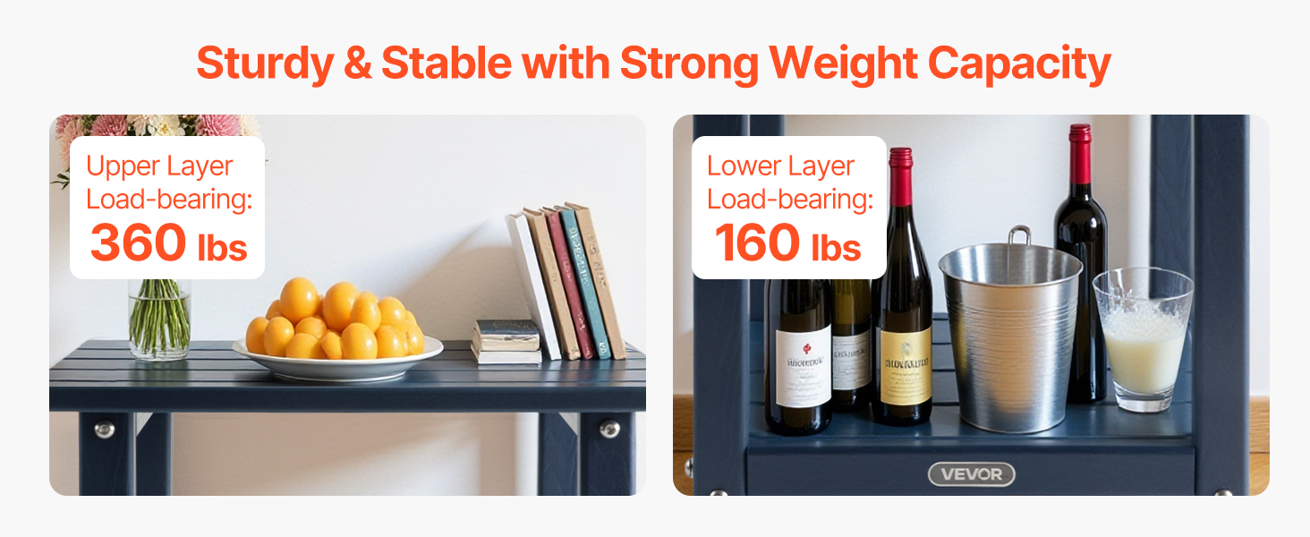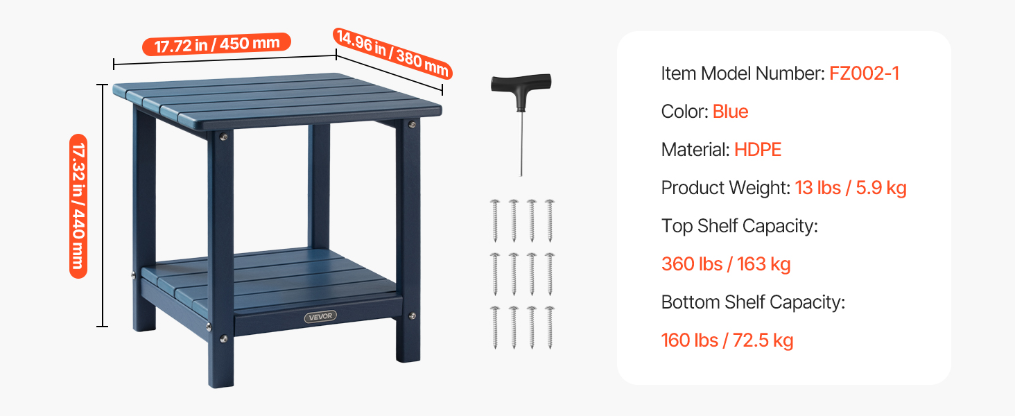 Tento vonkajší príručný stolík, vyrobený z vysokokvalitného materiálu HDPE a pevnej konštrukcie H-rámu, ponúka vynikajúcu pevnosť. Vrchná doska unesie až 360 kg a spodná polica až 160 kg.